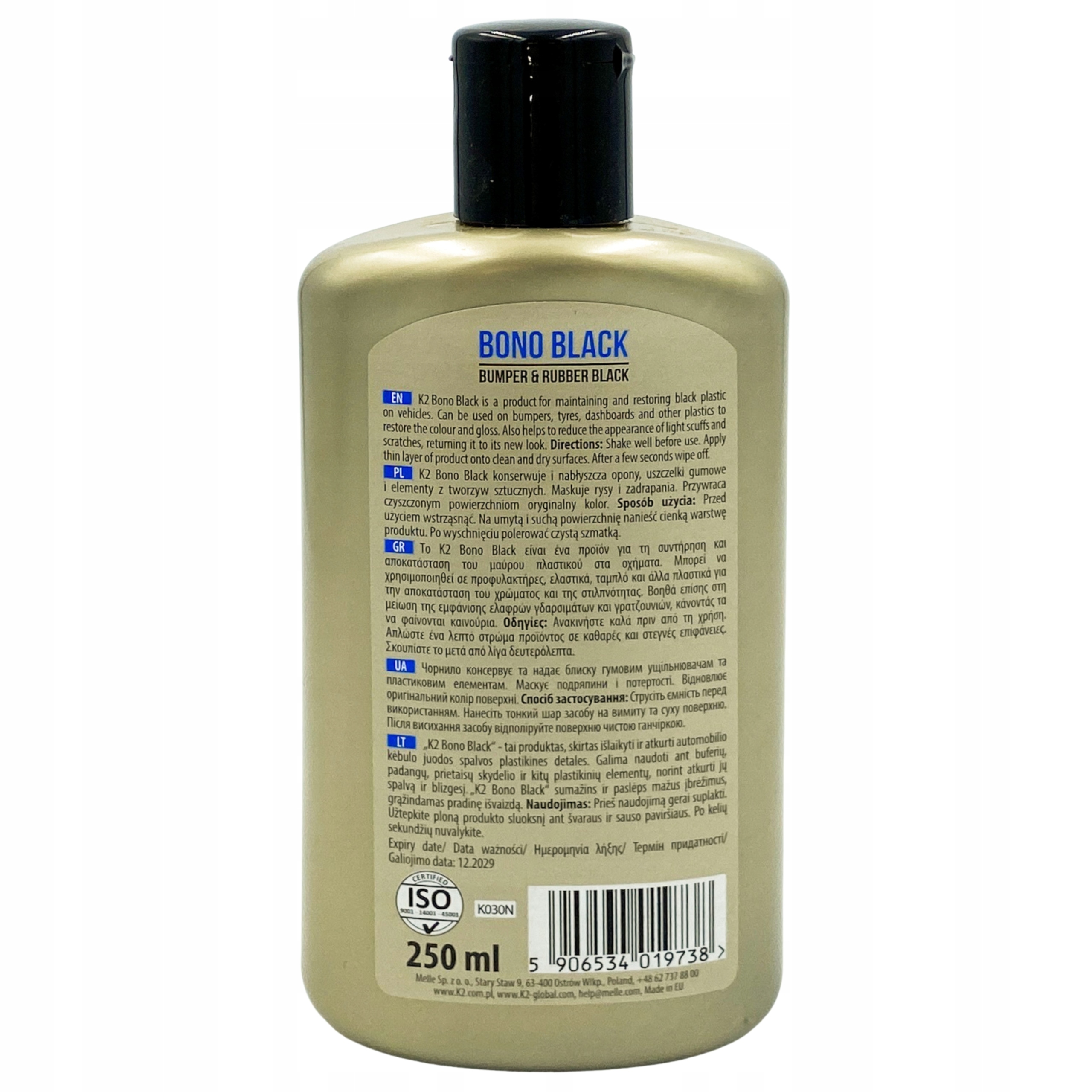 K2 BONO BLACK - це засіб для регенерації чорних пластикових елементів кузова, шин і ущільнювачів, що гарантує ефект помітно поживного і контрастного пластику.