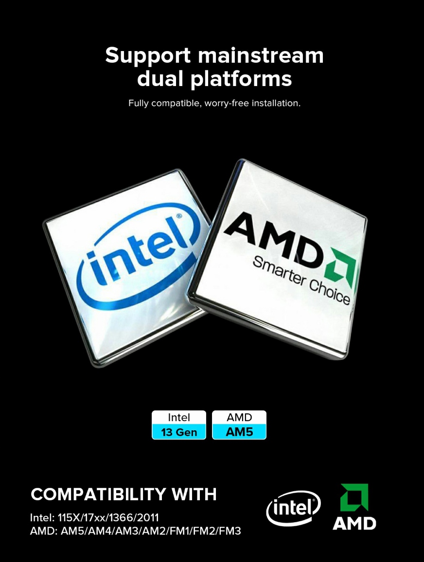 • Широка сумісність: Intel LGA 1851/1700/1200/2066/2011-3/2011/1156/1155/1151/1150, AMD AM5/AM4/AM3+/AM3/AM2+/FM2+/FM2