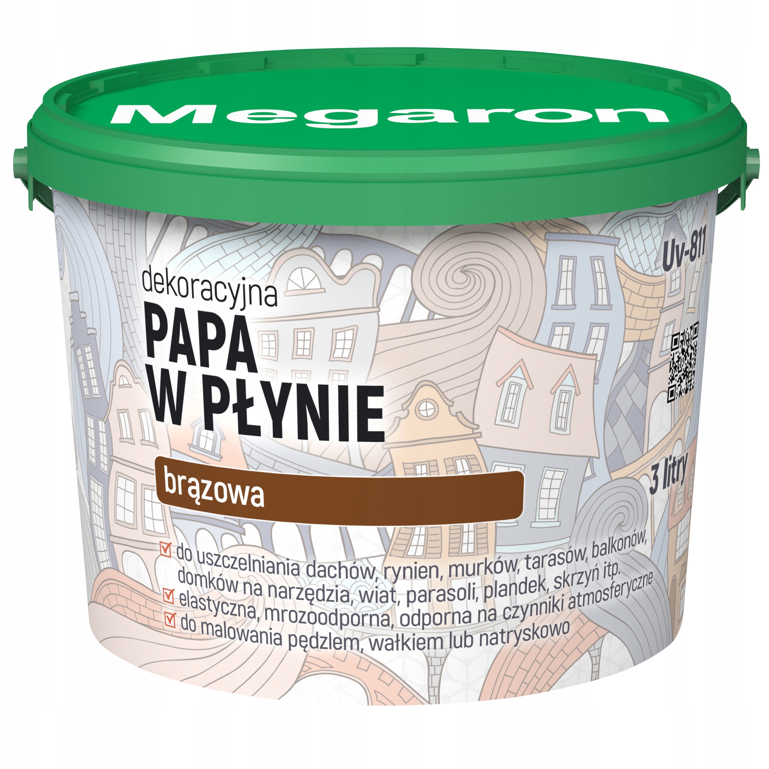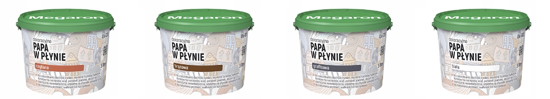 Декоративний рідкий покрівельний папір Megaron — це гнучкий покривний матеріал, який використовується для захисту зовнішніх поверхонь. Руберойд можна використовувати як в захисних, так і в декоративних цілях. За хімічним складом являє собою суміш мінеральної сировини, полімерної дисперсії, хімічних модифікуючих добавок і води, густої однорідної консистенції. Гнучкість і стійкість до контакту з водою забезпечують високу стійкість покриття незалежно від погодних умов.