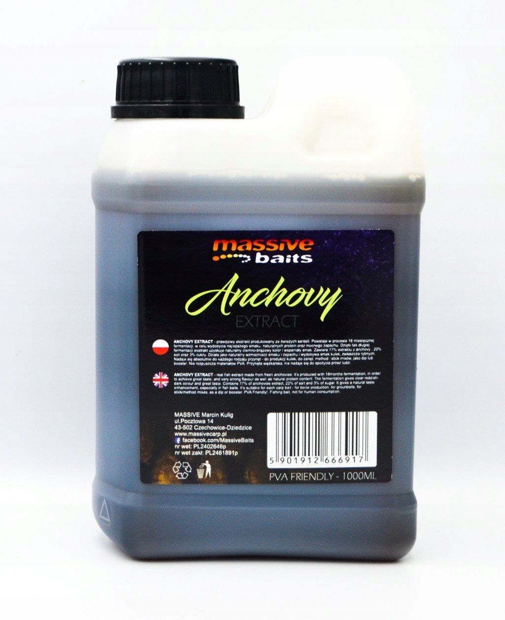 Екстракт анчоуса - справжній екстракт, що виробляється зі свіжої сардії. Він створюється в 18 -місячному процесі бродіння для отримання найкращого смаку, природних білків та сильного запаху. Завдяки такому довгому бродінням екстракт отримує природний темно -коричневий колір і чудовий смак. Він містить 77% Екскову, 20% солі та 3% цукру. Він працює як природний підсилювач смаку та запаху і виводить смак кульок, особливо риб. Він абсолютно підходить для всіх типів приманок - для виробництва кульок, для основних, методів та сумішей для палиць, як занурення або підсилювача. Не розчиняє матеріали PVA.