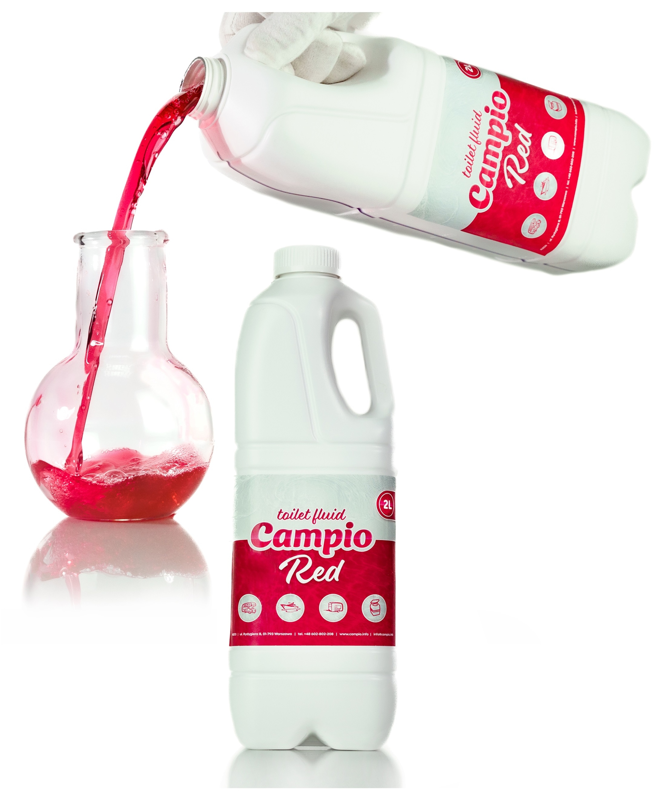 CAMPIO Red — рідина для туристичних туалетів, для використання в резервуарі для чистої води. Препарат полегшує утримання туалету в чистоті за рахунок підвищення ефективності змиву, зменшує утворення вапняного нальоту, надає приємний аромат, а спеціально підібраний склад створює враження свіжості та чистоти.