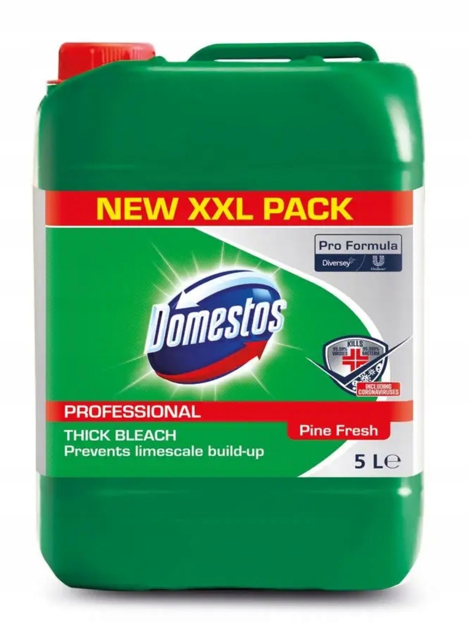 Domestos Professional Pine Fresh у формі концентрованого засобу для дезінфекції приладів і поверхонь в санітарних кімнатах, а також для миття та дезінфекції поверхонь у лікарнях та ін. заклади охорони здоров'я. Domestos Pine Fresh також можна використовувати для відбілювання білих тканин. Його густа консистенція сприяє кращому очищенню завдяки довшій адгезії до очищеної поверхні. Ефективний проти бактерій, грибків та вірусів, крім того, він дуже ефективний.