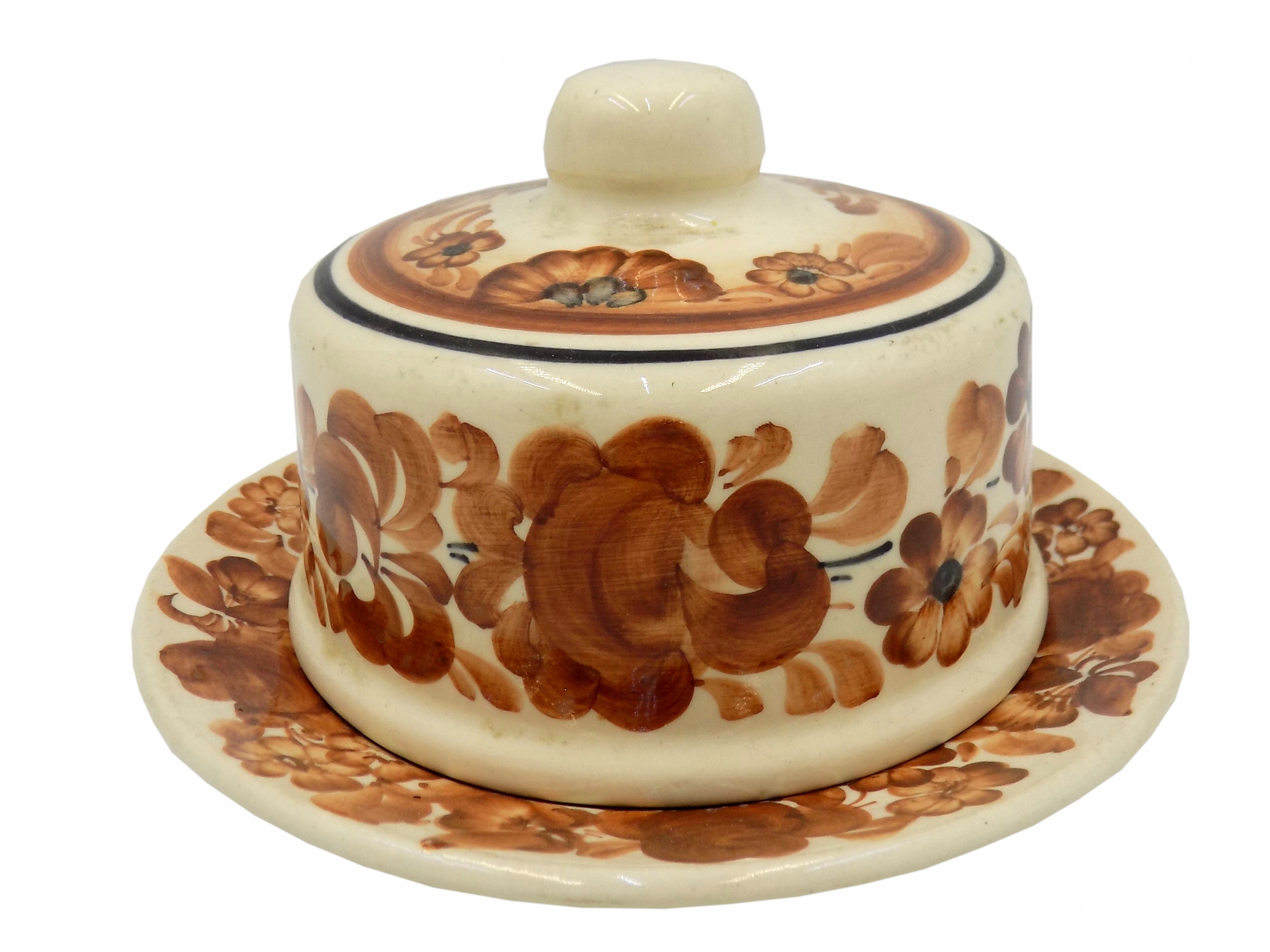 Фаянсова маслянка з Влоцлавека 1970-1980-х років. Підписано. Ручний розпис. Розміри; висота 9 х 17 см. Сліди використання. Стан товару видно на фото.