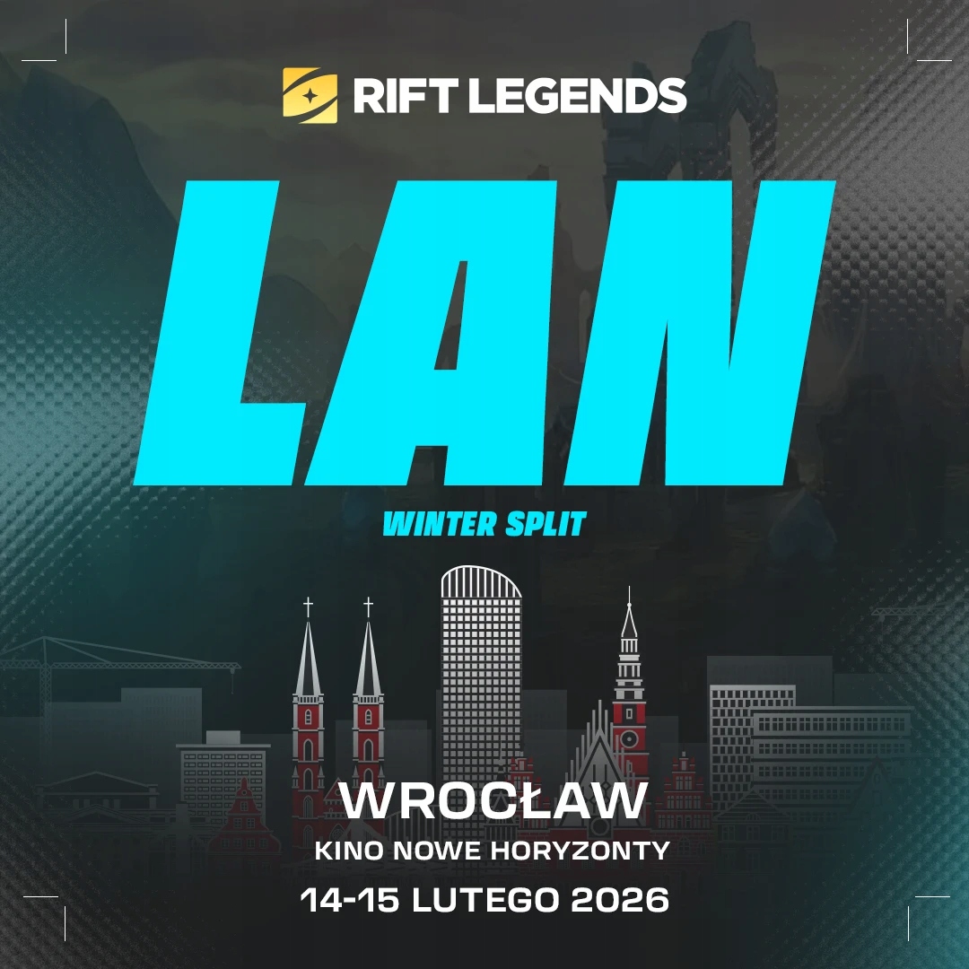 Rift Legends Winter Split 2026 – початок сезону наживо у Вроцлаві Зимовий раунд Rift Legends починається на надзвичайно сильній ноті. Замість одного LAN-матчу ми відкриваємо сезон дводенним фестивалем кіберспортивних емоцій у самому центрі Вроцлава – у культовому кінотеатрі New Horizons. Rift Legends Polish Championship – Winter Split 2026 деталі Протягом двох днів ви побачите на сцені всі вісім команд ліги Rift Legends, які виступатимуть перед аудиторією з понад півтисячі шанувальників League of Legends. Це перший подібний старт сезону в історії ліги! Що вас там чекає: Офіційні матчі Rift Legends - League of Legends Polish Championship Winter Split 2026 Виступи всіх 8 команд ліги Найкращі гравці та впливові особи польської сцени LoL Повноцінне LAN виробництво в унікальному просторі кінотеатру Командні стенди Кіберспортивні емоції протягом усіх вихідних Це чудова нагода розпочати Winter Split 2026 наживо, відчути атмосферу змагань і побачити лігу Rift Legends у новій версії.