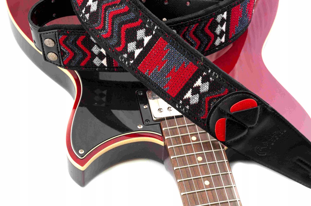 візерунок, король відноситься до стародавньої Мексики та ацтекської культури. Дивовижний принт, який ідеально поєднується з кожною гітарою чи басом. Барвистий принт чорного, червоного, сірого, з трохи білим, тонко змішується в чорний закладки. Він має 6 см завширшки і має регульовану довжину від 95 до 145 см із ексклюзивною системою RAS (система регулювання правої системи) для регулювання ременя на потрібну довжину.