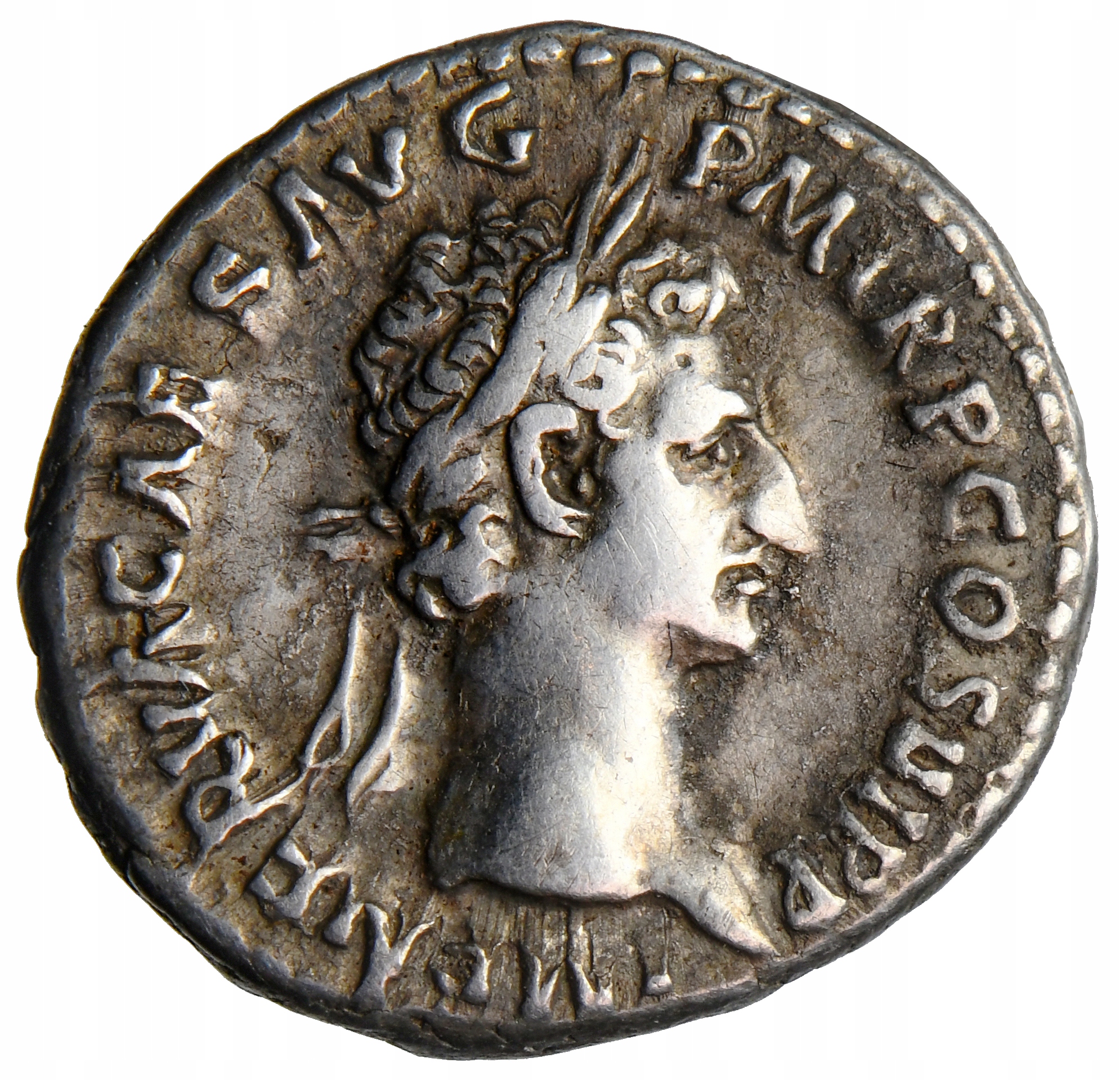 Av. IMP NERVA CAES AVG - P M TR P COS II P P, голова імператора в лавровому вінку праворуч.
