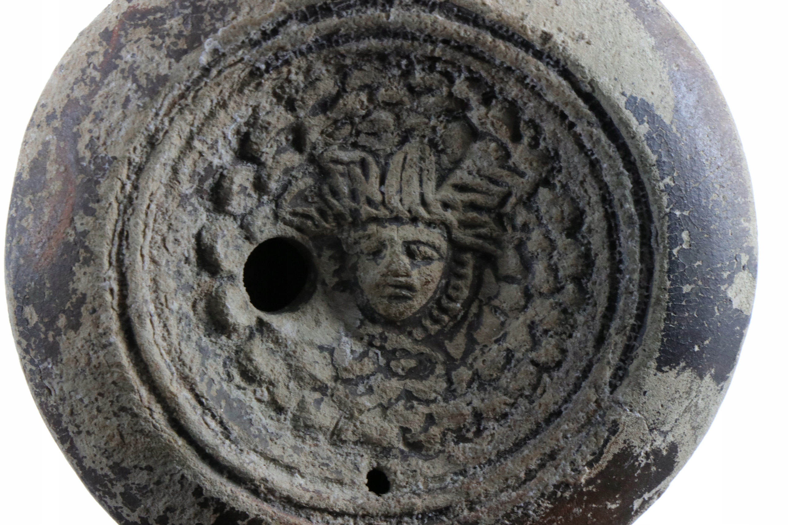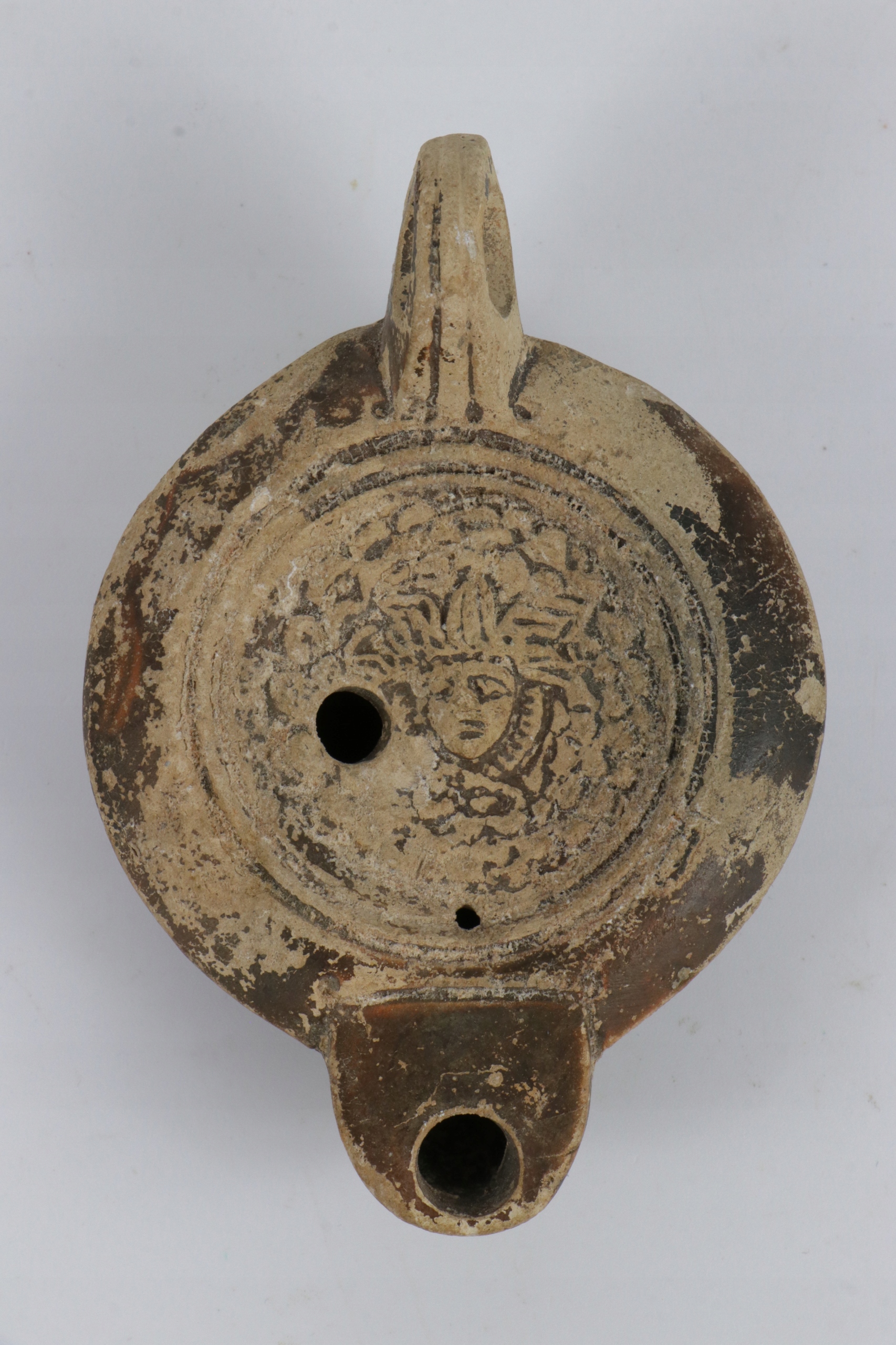 Лампа, прикрашена рельєфною головкою, покрита частково збереженою глазур’ю. Більший отвір для наповнення оливковою олією, менший отвір для вентиляції. Лампа Loeschcke.