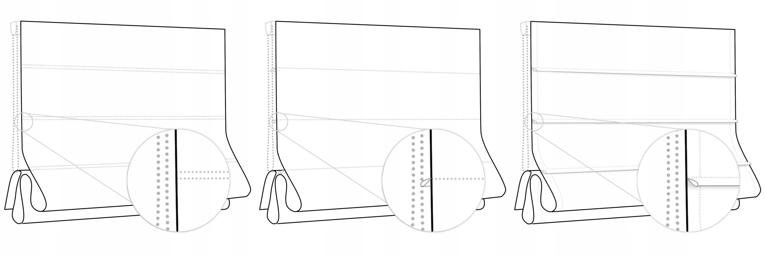 Тунелі рулонних штор розташовані на тильній стороні виробу бавовняними стрічками під колір тканини. Модель рекомендована для тканин з малюнком. Рулонна штора має систему Safe Child.