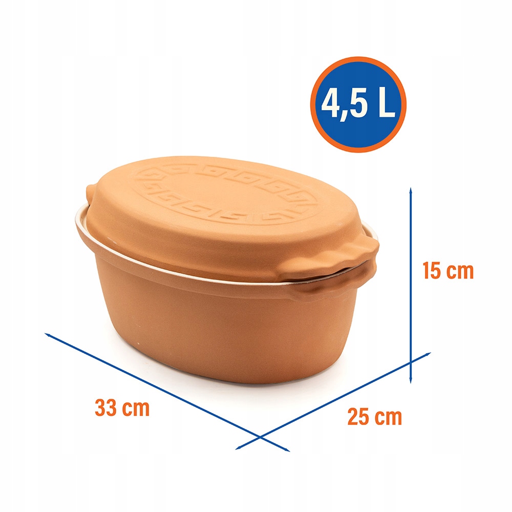 ємність 4,5 літра , овальна форма і засклений інтер'єр Зробіть цей глиняний горщик з обкладинкою ідеальним інструментом для тих, хто шукає поєднання традиції з сучасною зручністю. виготовлена з натуральної глини , підданої ретельному спалюванню та , покритому емалі , ця форма гарантує навіть розподіл тепла, сприяє поведінці ароматів і полегшує очищення внутрішньої частини горщика. POT підходить для використання в духовці до максимальної температури 200 ° C . Не підходить для використання на газових або індукційних печах. рекомендується замочити кришку у воді приблизно за 10 - 15 хвилин до кожного використання.