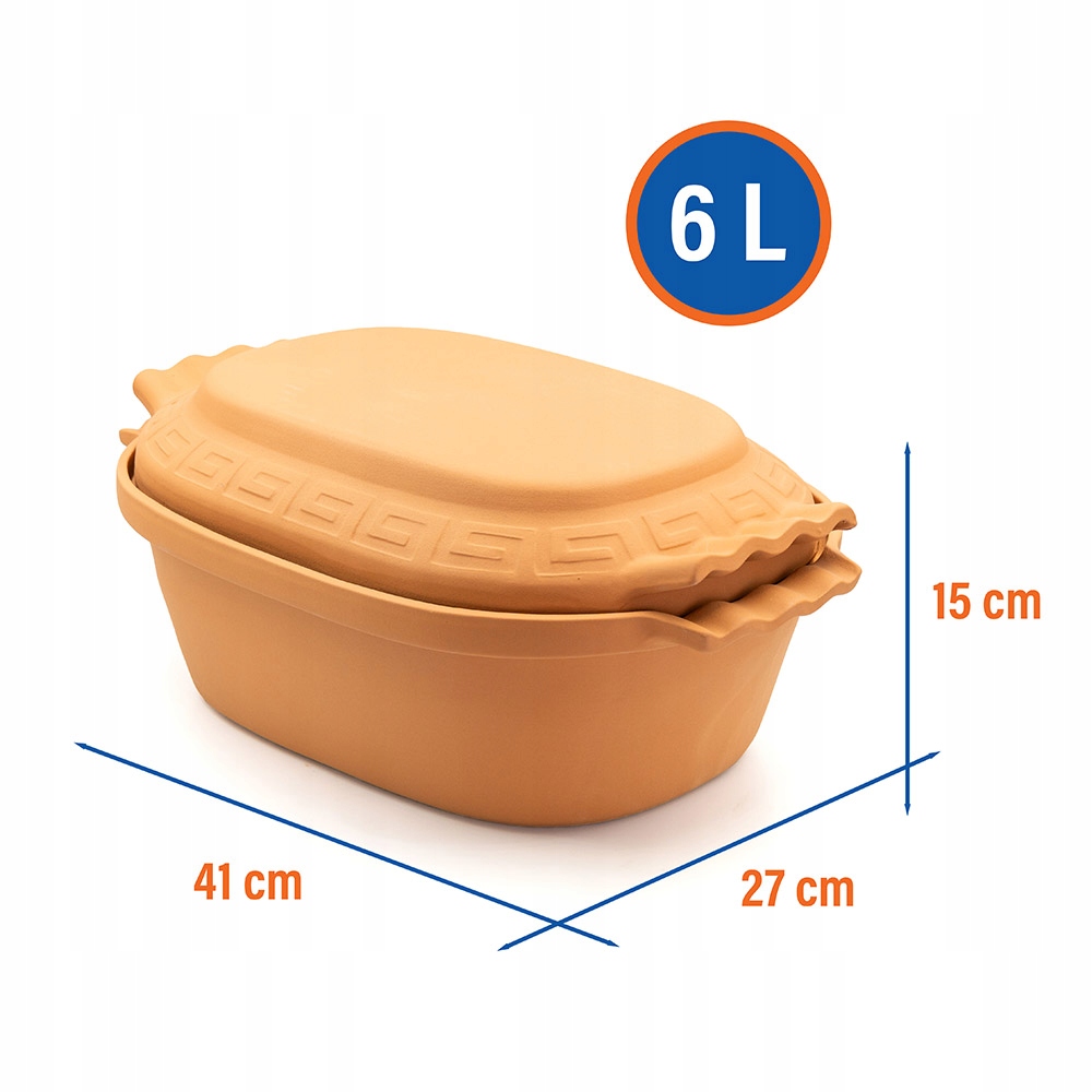 ємність 6 літрів , овальна форма і пористий інтер'єр Зробіть цей глиняний горщик з обкладинкою ідеальним інструментом для тих, хто шукає поєднання традиції з сучасною зручністю. виготовлена з природної глини і піддається ретельному спалюванню, ця форма гарантує навіть розподіл тепла, сприяє поведінці ароматів. POT підходить для використання в духовці до максимальної температури 200 ° C . Не підходить для використання на газових або індукційних печах. Рекомендується замочити судно перед кожним використанням , загалом з кришкою , у воді приблизно 10 до 15 хвилин .