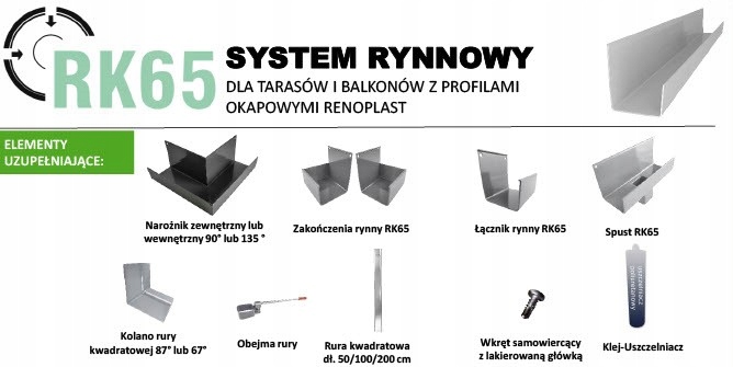 Жолоб балконний RK65 шириною 65 мм виготовлений з алюмінію з порошковим покриттям. Сумісний з карнизними профілями Renoplast W60, W35 і W20R.