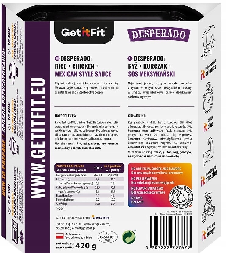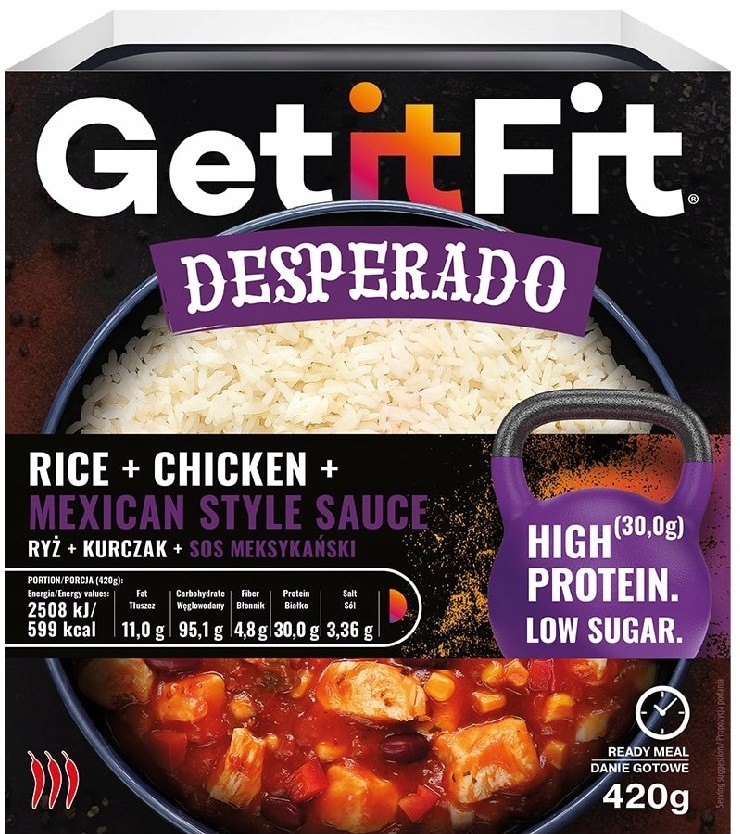Get it Fit Desperado — це соковиті шматочки курки з рисом у гострому мексиканському соусі. Відмінний смак, багата білком (до 30 г на порцію) страва для активних людей