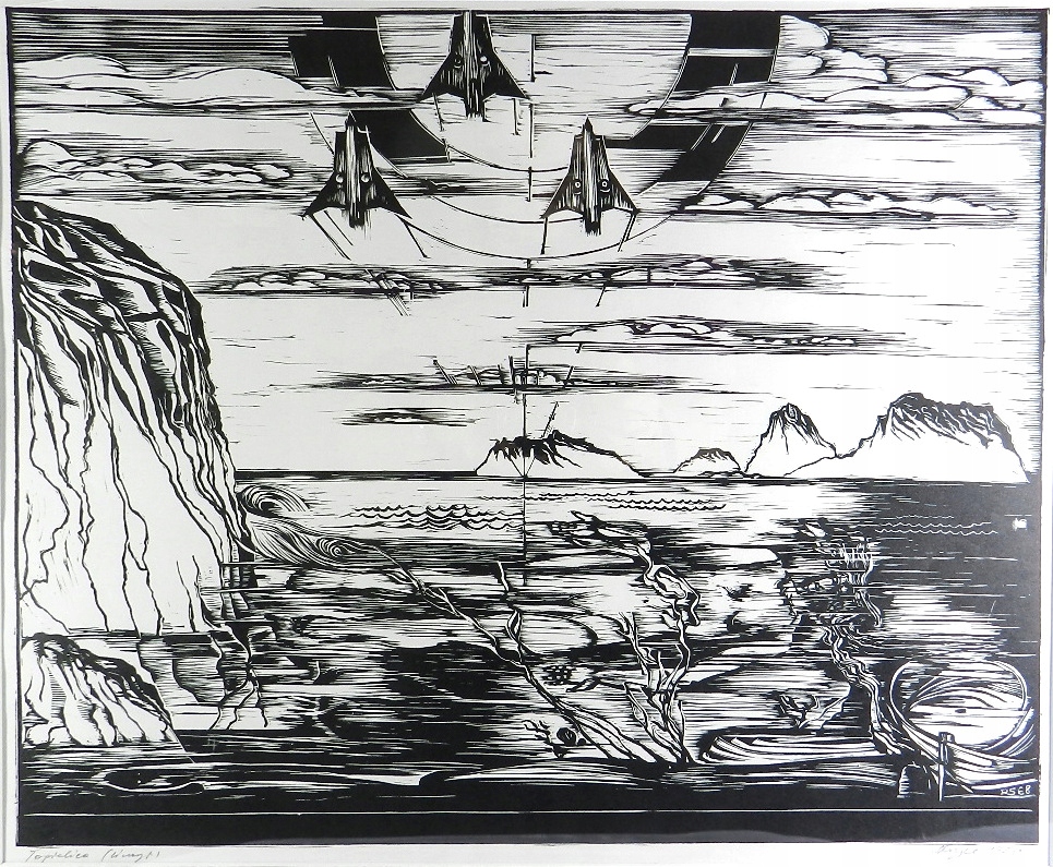 Підписано, датовано та написано внизу: Topielica (linocut) Stryjec 1968; і на нижньому диску: RS68
