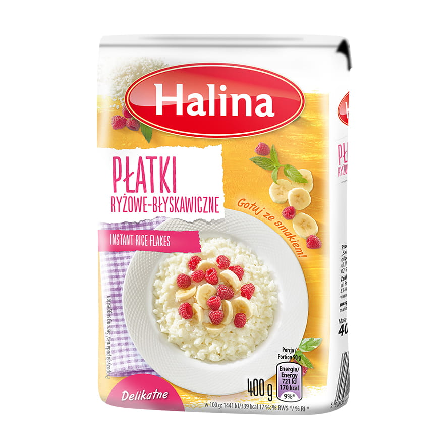 Рисові пластівці швидкого приготування Halina — ідеальна ідея для швидкого сніданку, особливо приготованого з молоком і свіжими фруктами. Пластівці отримують із рисових зерен, підданих пропарюванню та пресуванню. Це дає можливість приготувати їх так швидко. Вони є цінним продуктом через низьку жирність і багатий набір поживних речовин.