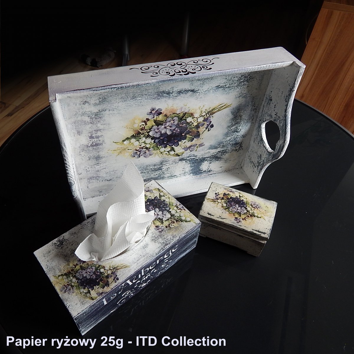 - Застосування: техніка декупаж на ящиках, фанері, основі з пінополістиролу, склі, тканині