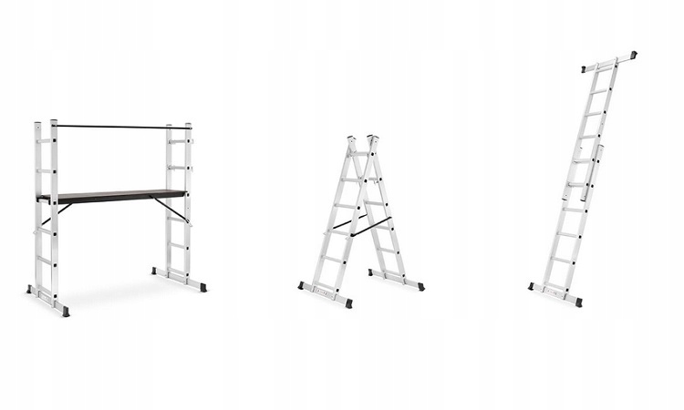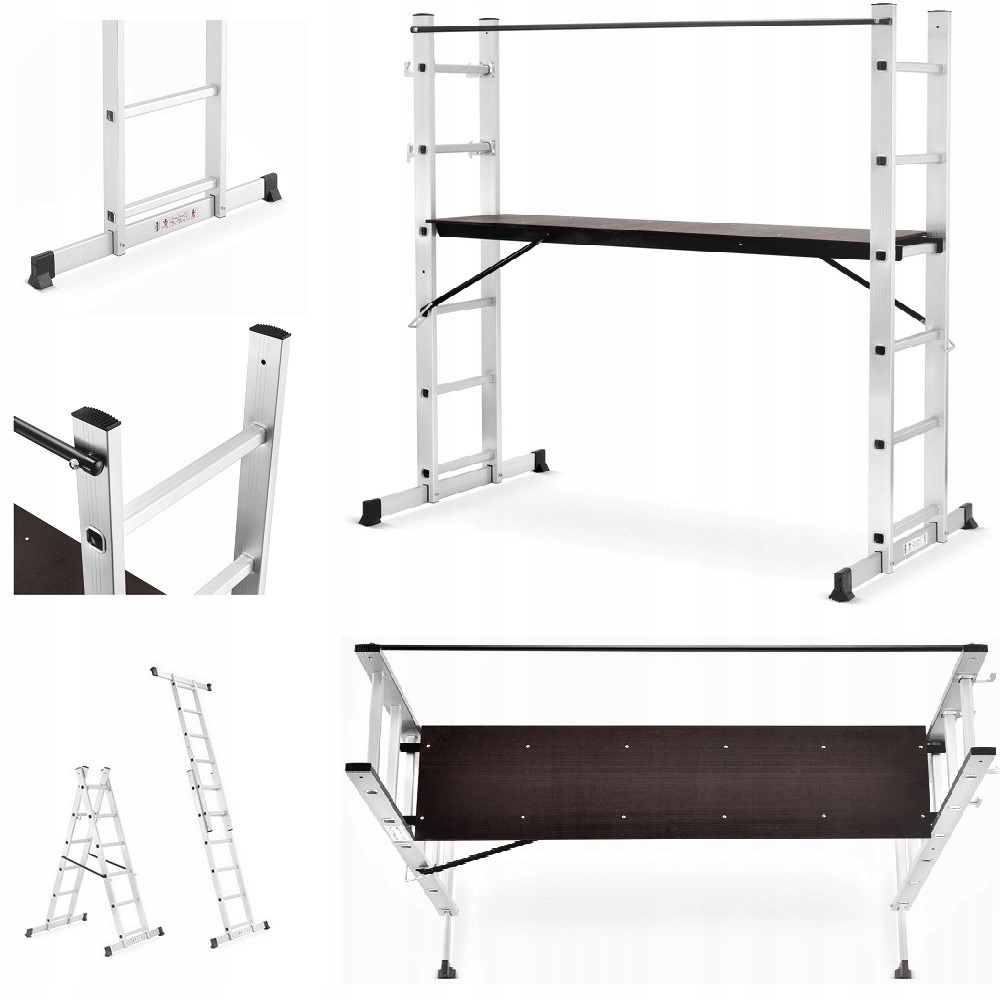 Практичні риштування призначені для ремонту приміщень і роботи в саду. Він дуже функціональний. Через хвилину він може перетворитися на розсувну драбину з вильотом до 2,75м практична платформа вантажопідйомністю до 150 кг. Він може бути побудований на висоті від 43 до 100 см (рекомендовано до 100 см, вище, що ви повинні використовувати захист, наприклад, ремінь) p>