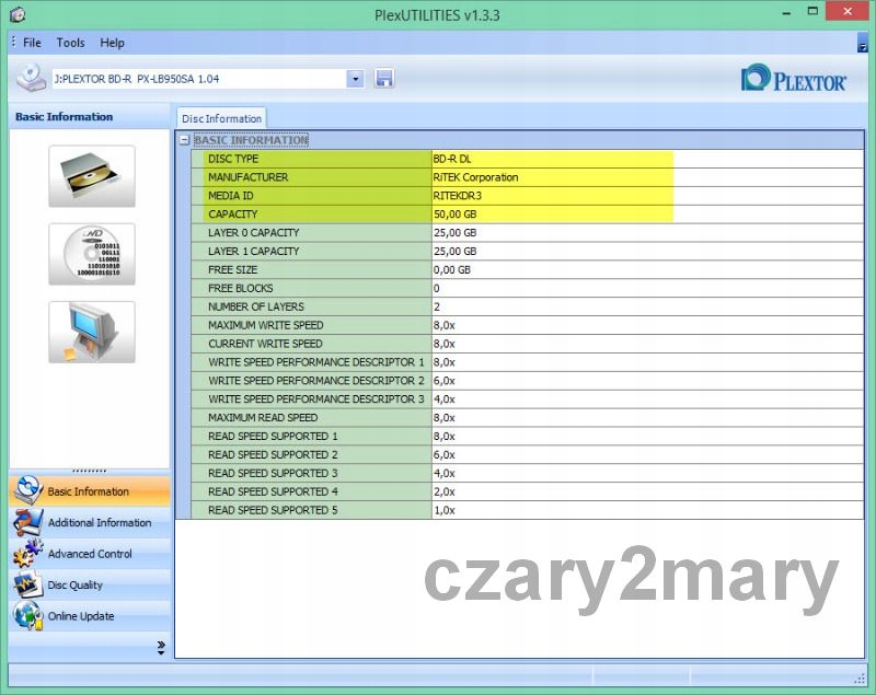 На фото та екрані з діагностичних програм показаний пропонований носій для друку RITEK BD-R DL 50GB 1-6X