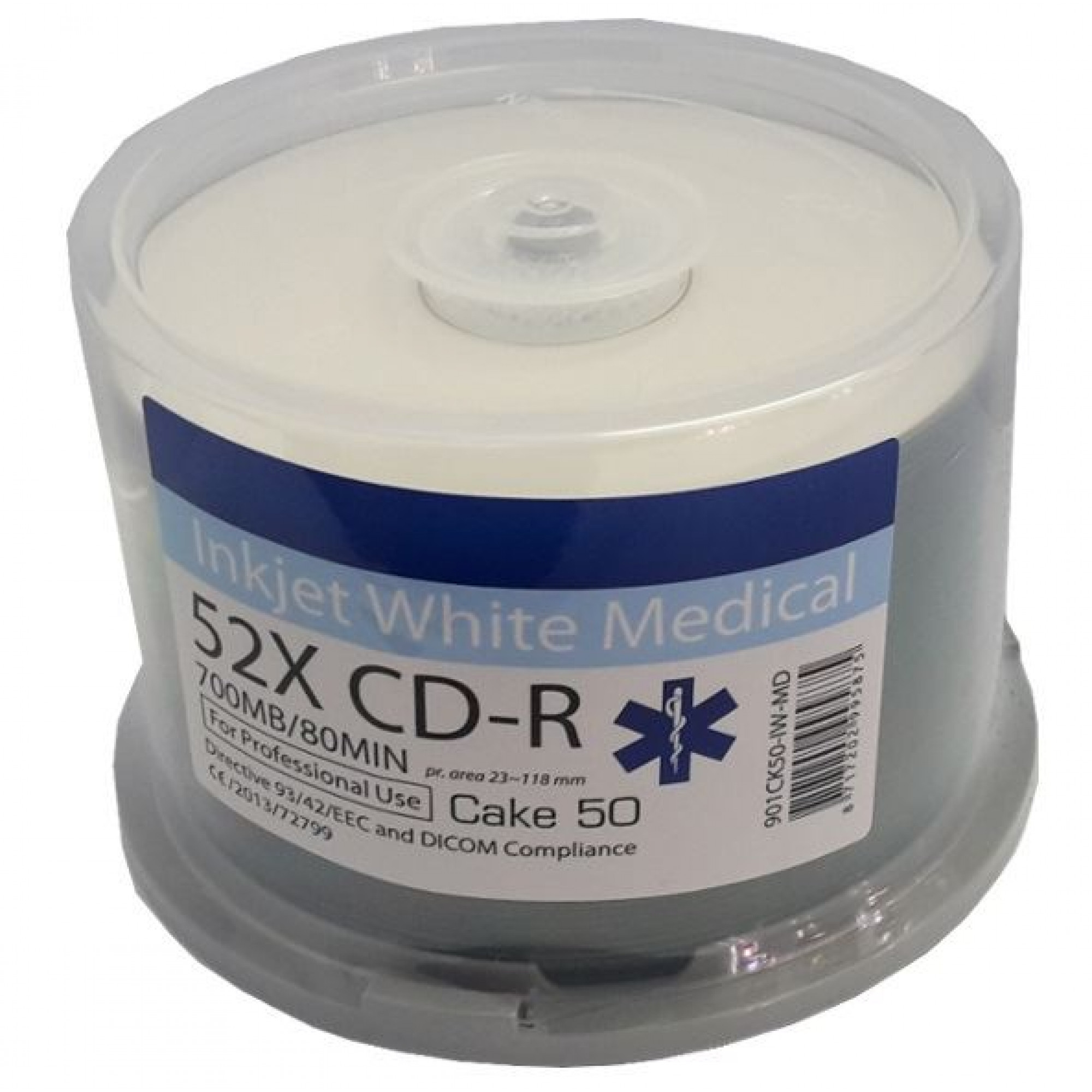 50 частин найякісніших професійних носіїв для медичного використання. Призначений для запису тестів, даних пацієнтів і всіх типів матеріалів, що використовуються в медичних установах Це єдиний диск, який відповідає стандартам продукту, схваленого для медичного використання, що підтверджено такими сертифікатами: CE, DICOM і відповідність ЄС директива 93/42/ЄЕС. Диски, сумісні з розмножувачами та медичними принтерами. Швидкосихаюча точна поверхня для струменевого друку. Сумісний, зокрема, з принтерами Primera та Rimage. Забезпечує довготривалу безпеку збережених даних.