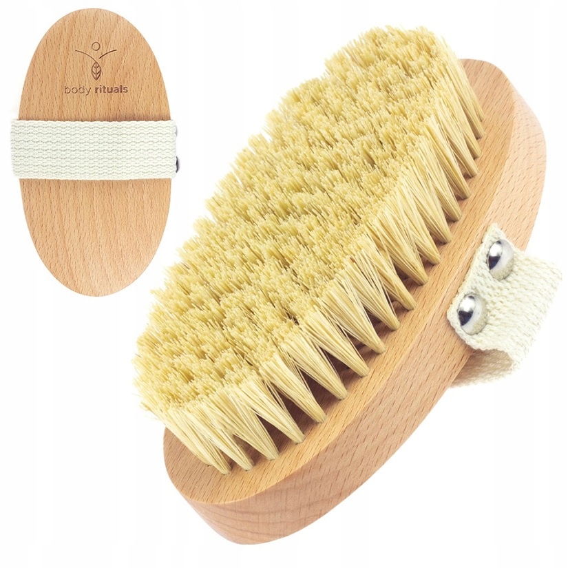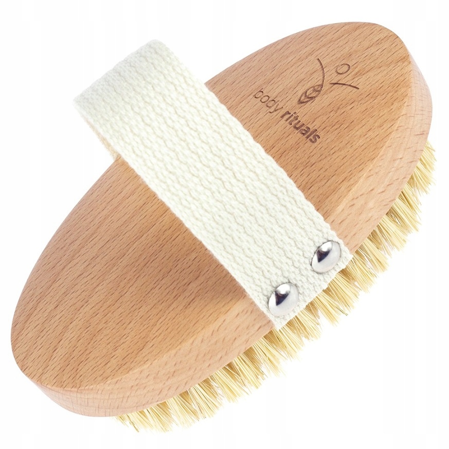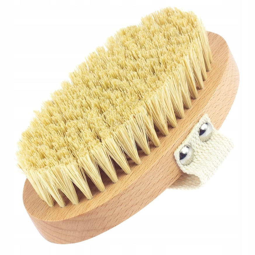Овальна щітка з бука для сухого масажу тіла, з натуральною щетиною агави tampico. Для його виготовлення використовувалися матеріали найвищої якості. Регулярне використання масажної щітки розгладжує шкіру, вирівнює її колір, зменшує целюліт і сприяє виведенню токсинів з організму.