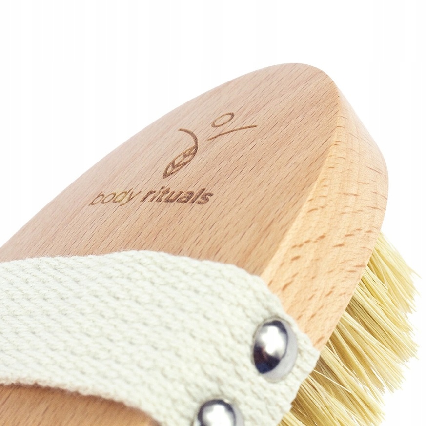 Щітка для сухого масажу від Body Rituals виготовлена з матеріалів найвищої якості: натурального волокна сизалевої агави (тампіко) та дерева бука. Має відповідну овальну форму та плетену бавовняну ручку, завдяки чому ідеально лежить в руці та зручна у використанні. Щітку не можна намочувати.
