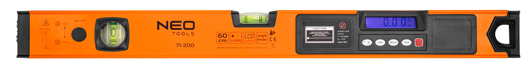 Рівень з електронним дисплеєм LCD NEO (арт. 71-200), довжиною 60 см, є необхідним інструментом для оздоблювальних або ремонтних робіт. Має три режими визначення: вертикальний, горизонтальний і прямий кут. Точність вимірювання становить +/- 3 мм на відстані 10 м, після отримання таких кутів: 0°/45°/90°. Живлення від двох батарейок типу ААА 1,5 В.