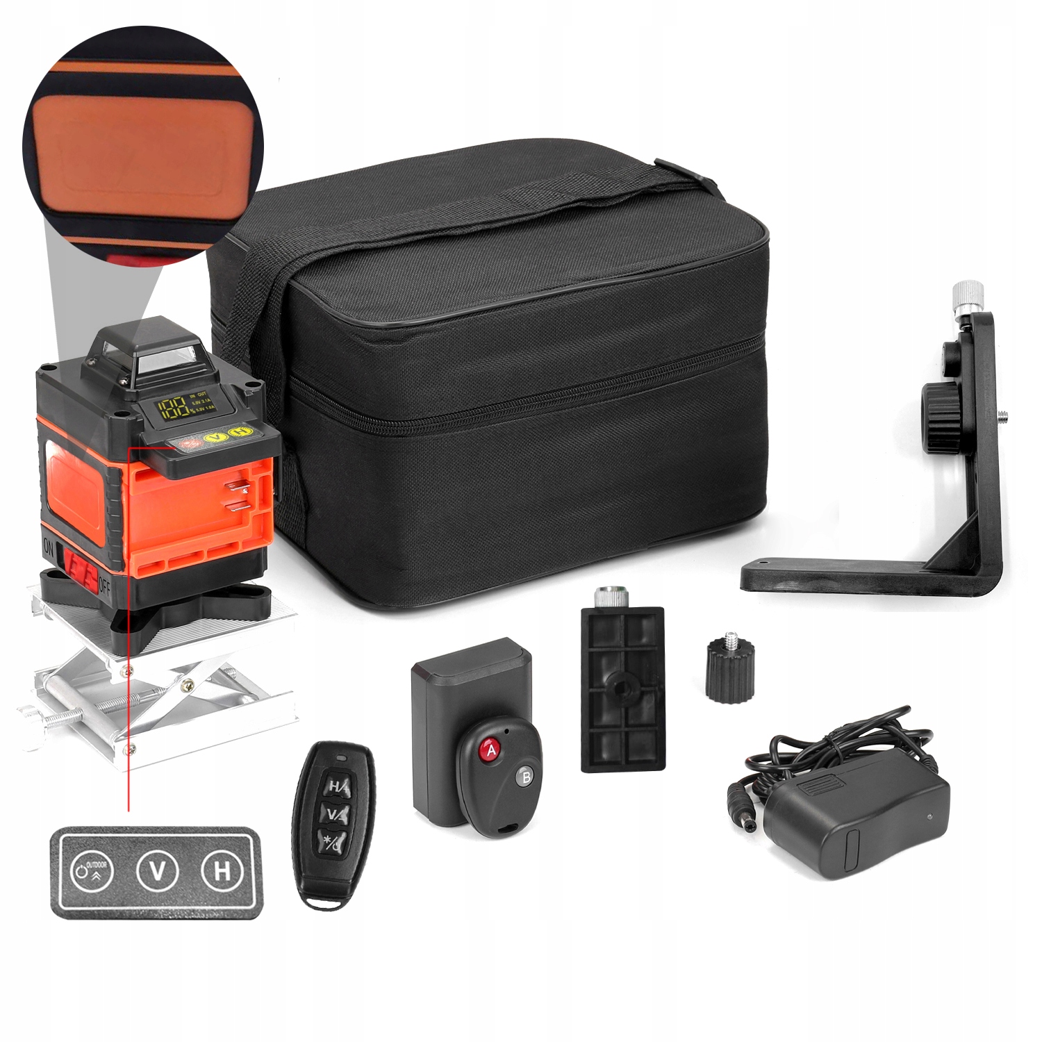 Три сенсорні кнопки, одна кнопка OUTDOOR/Open, одна кнопка V і одна кнопка H, діагональна лінія, горизонтальна лінія та вертикальна лінія з чітким розподілом (лазерна лінія яскравіша в режимі надворі)