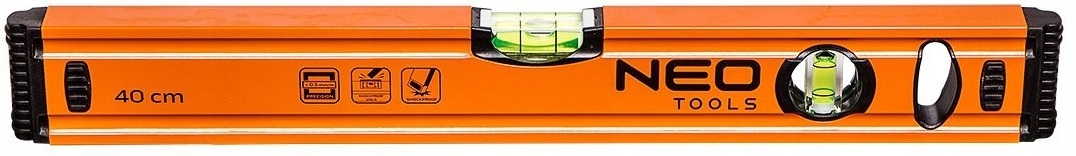 Ніжка довжиною 40 см від Neo Tools забезпечує точні вимірювання завдяки фрезерованій вимірювальній поверхні. Алюмінієвий рівень легкий і міцний, що полегшує його перенесення і забезпечує тривалий термін служби. Цей матеріал також стійкий до корозії, що важливо, особливо якщо інструмент буде використовуватися у вологих або складних умовах.