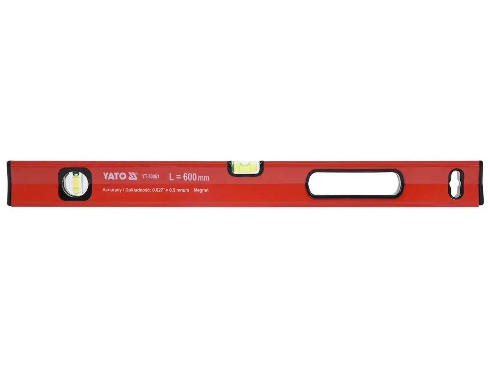 Рівень магнітний зі стійкого алюмінієвого профілю l-600 мм сильний магніт, що забезпечує міцне зчеплення зі сталевими та іншими магнітними поверхнями (це полегшує роботу при складанні конструкцій, розміщенні гіпсокартонних профілів тощо) Ватерпас оснащений торцевими бамперами з пластику, які ефективно захищають від наслідків випадкових ударів спеціальний отвір для підвішування рівня, напр. на стіні з інструментами або на полиці магазину алюмінієвий профіль постійно захищений шаром порошкового лаку точність рівня 0,5 мм/м рівень: 2 флакони з акрилового скла наповнений жовтою рідиною, яка покращує видимість ефект прозорого збільшувального скла дзеркальна полірована поверхня під флаконом створює враження освітленості, що значно полегшує спостереження та точне вимірювання флакони позначають вертикальні та горизонтальні обрамлений ударопоглинаючим матеріалом В наявності моделі 40, 60, 80, 100 і 120 см. Для точної розмітки вертикальних і горизонтальних ліній.