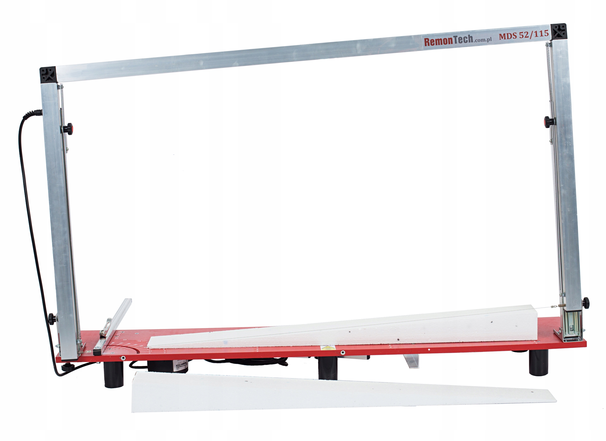 - Конструкція нашої машини для пінополістиролу дозволяє точно розрізати матеріал. Використання цього верстата дозволяє вирізати плиту з клина (наприклад, для дахів, терас і т.д.) з різницею довжини плити до 8 см (наприклад, 8 см з одного боку і 16 см товщиною з іншого) . Є можливість встановити різні кути різання, як вертикально, так і горизонтально, в діапазоні від 0 до 90 градусів. Максимальна товщина розрізаного матеріалу 52 см, довжина 115 см