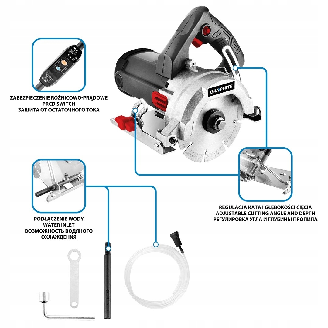 Фреза для кераміки та каменю GRAPHITE 1400 Вт, 125 мм 59G888 — інструмент для вологих і сухих робіт потужністю 1400 Вт, з диском 125 мм х 22,2 мм. Досягає 12 000 обертів за хвилину. Фреза оснащена регульованим кутом різу (0-45%) і регулюванням глибини різу. Має автомат захисного відключення, що впливає на безпеку його використання, а сам вимикач інструменту додатково захищений від пилу та затоплення. Пристрій призначений для точного різання кераміки та кераміки. Завдяки невеликим розмірам, вазі всього 3,2 кг і мобільному дизайну він ідеально підходить для ручної роботи. Забезпечує хорошу видимість лінії різу. Правильно спрофільована ручка забезпечує надійне захоплення, що впливає на точність обробки. В комплект фрези входить поливний набір, диск 125 мм і ключі для розбирання/складання (труба, плоска). Інструмент торгової марки GRAPHITE рекомендований професіоналам і любителям DIY.