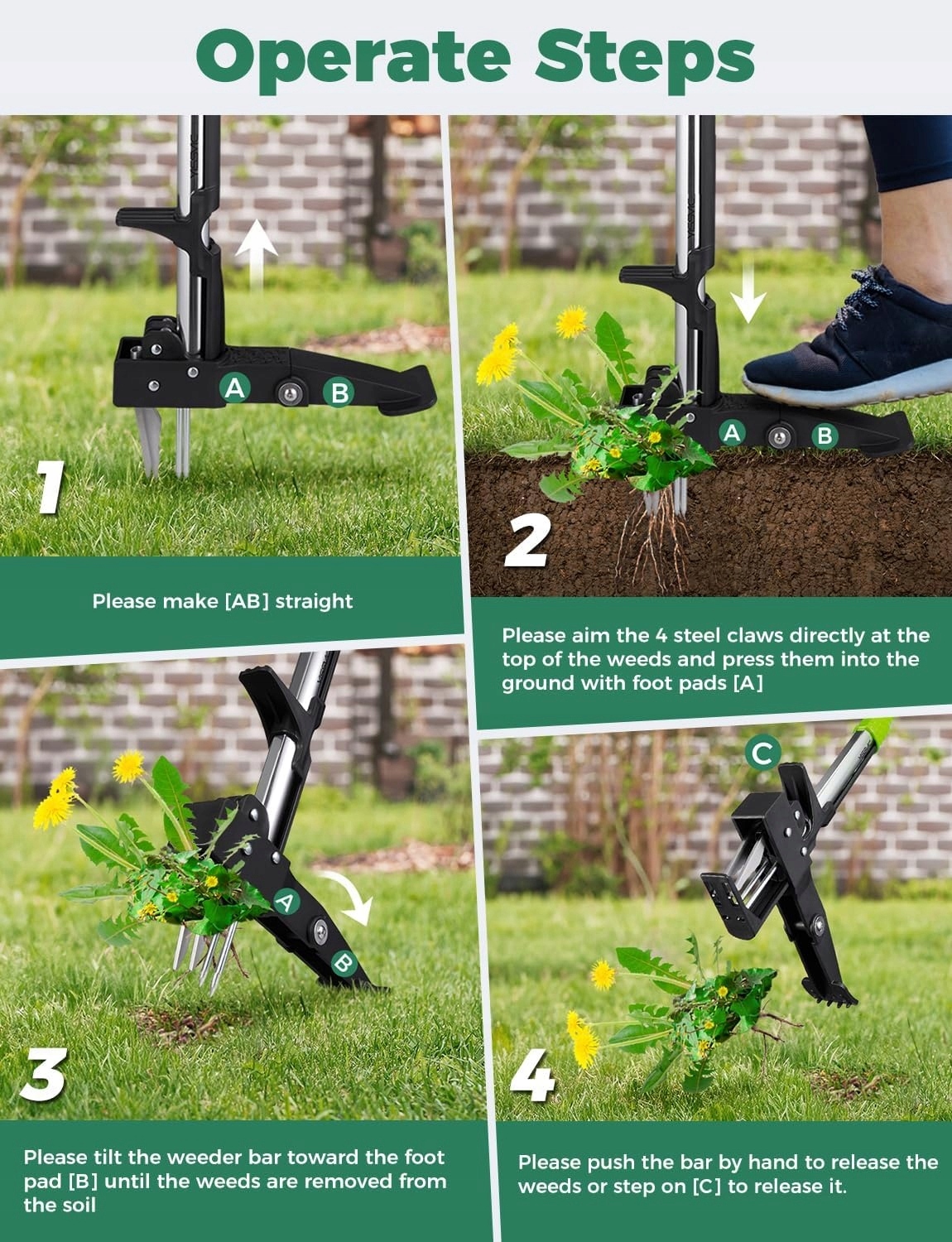 Прості та ефективні прополки: Досягнення високої ефективності прополки лише за три прості кроки. Покладіть інструмент над бур’яном, притисніть кігті в землю навколо коренів бур’янів і використовуйте ручку, щоб витягнути бур’ян із землі.