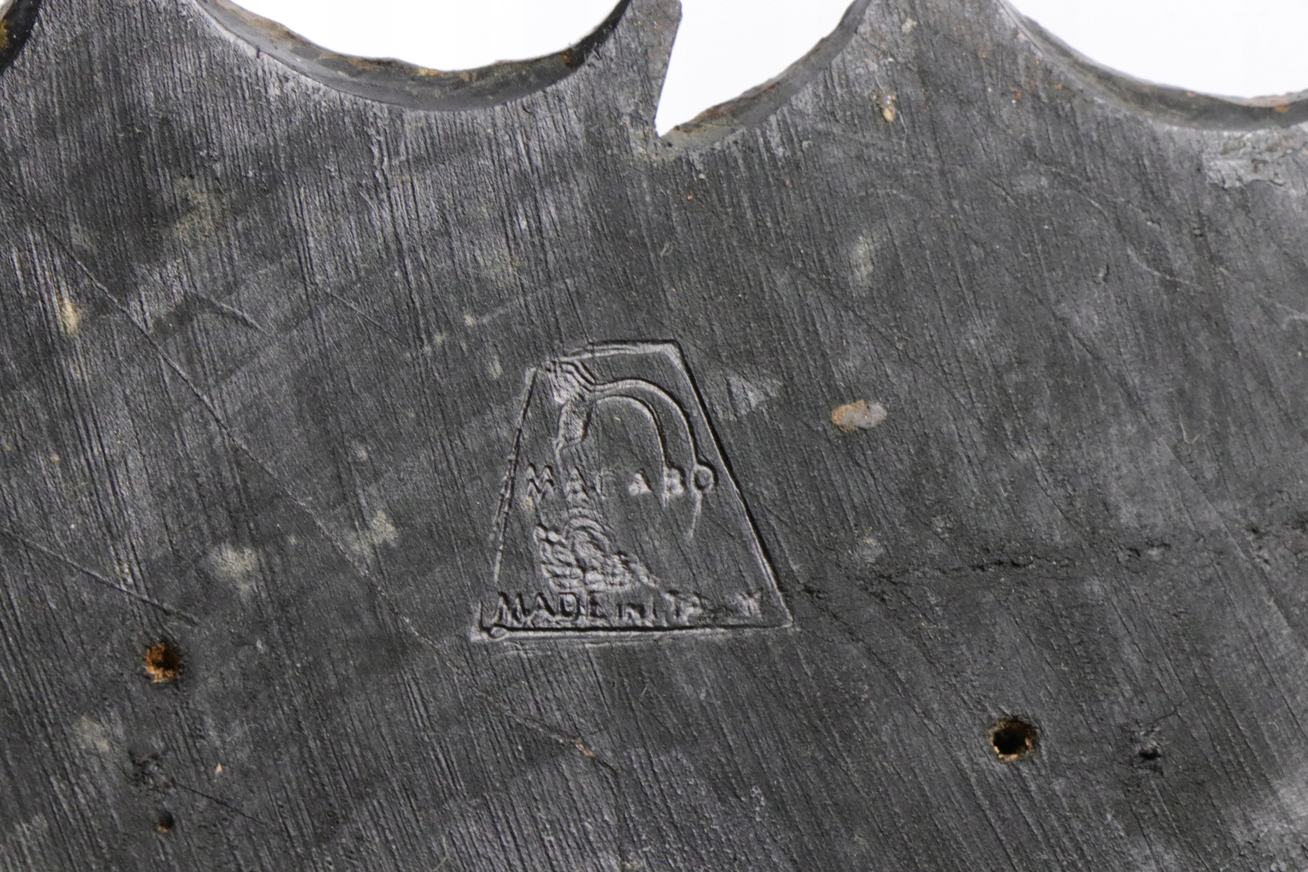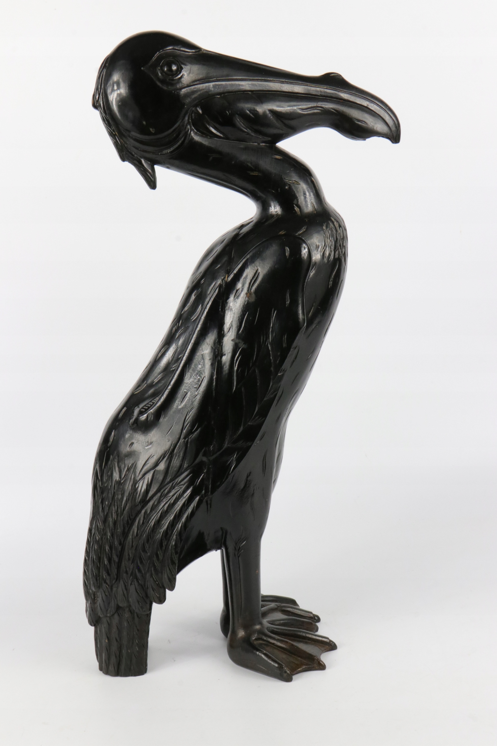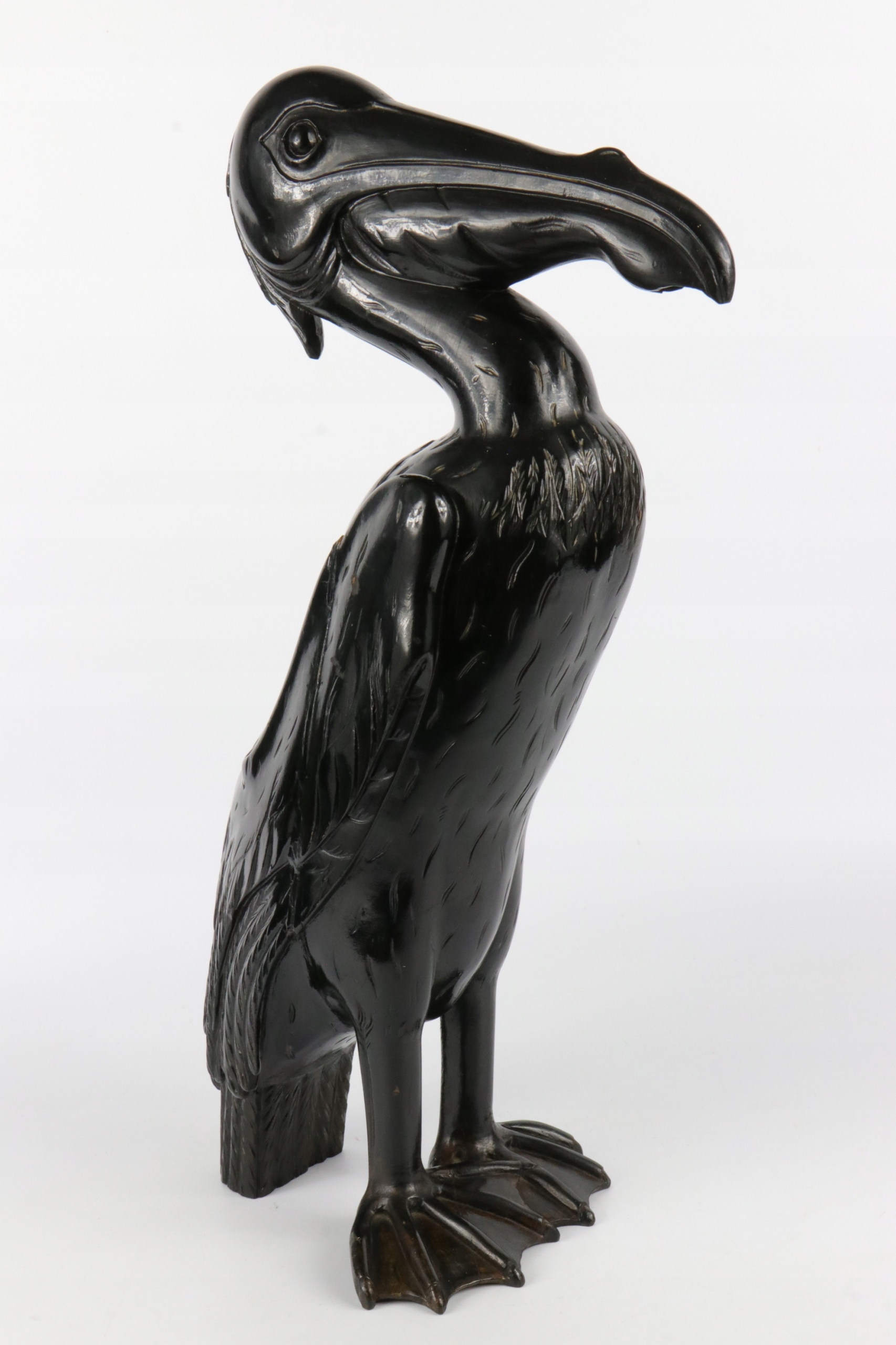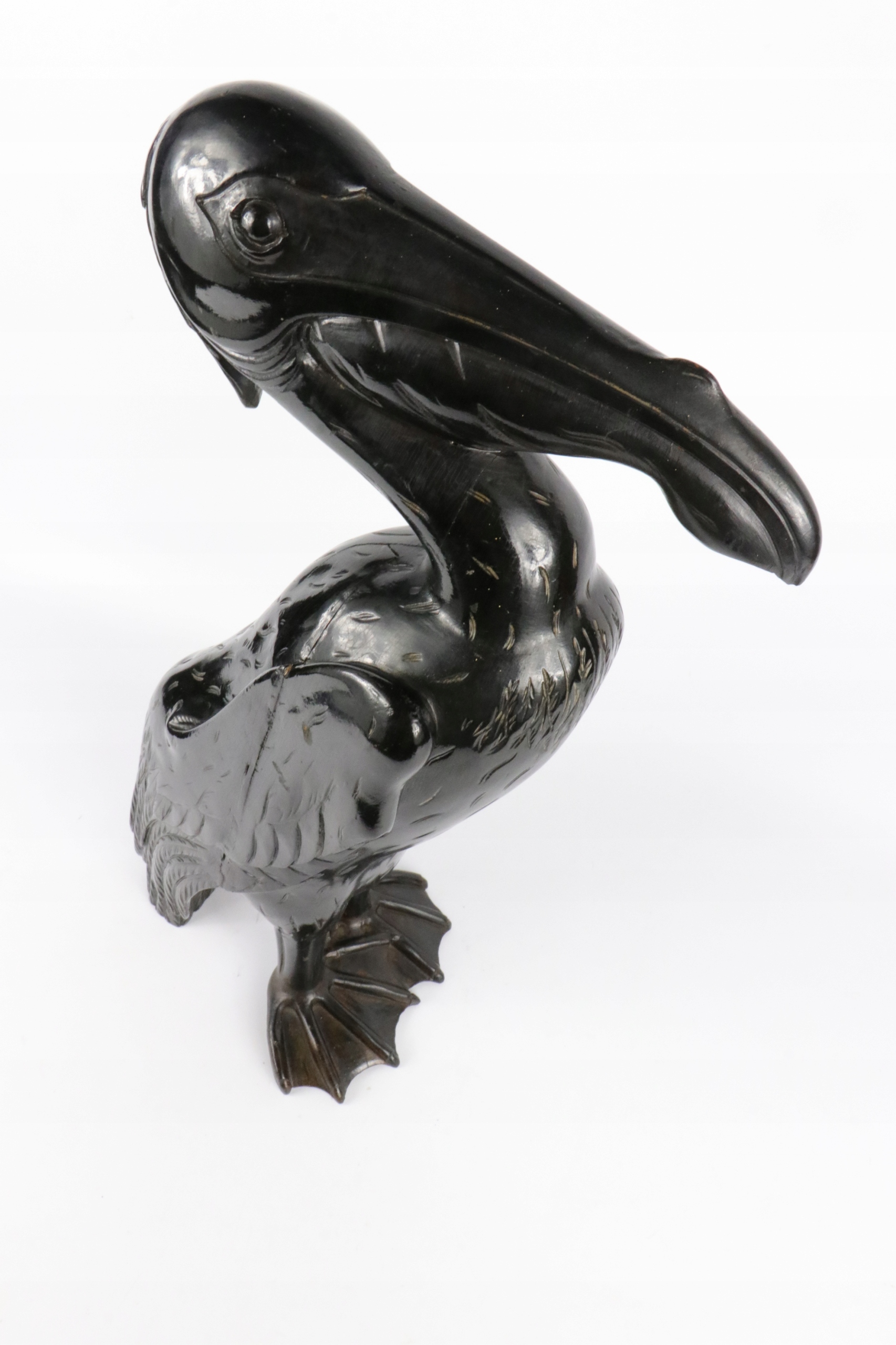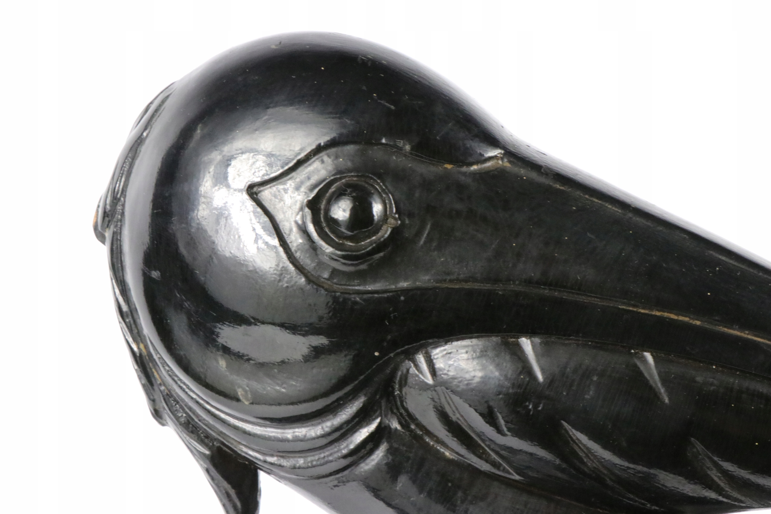 Цікава, дуже оригінальна скульптура пелікана з чорного дерева. Фігурка, швидше за все, є основою лампи, всередині фігурки є отвір для кабелю, який закінчується на кінці дзьоба птаха. Пелікан із знаком дельфіна та написом Madabo в Італії під ним. На мій погляд, фігура модерну початку 20 століття.