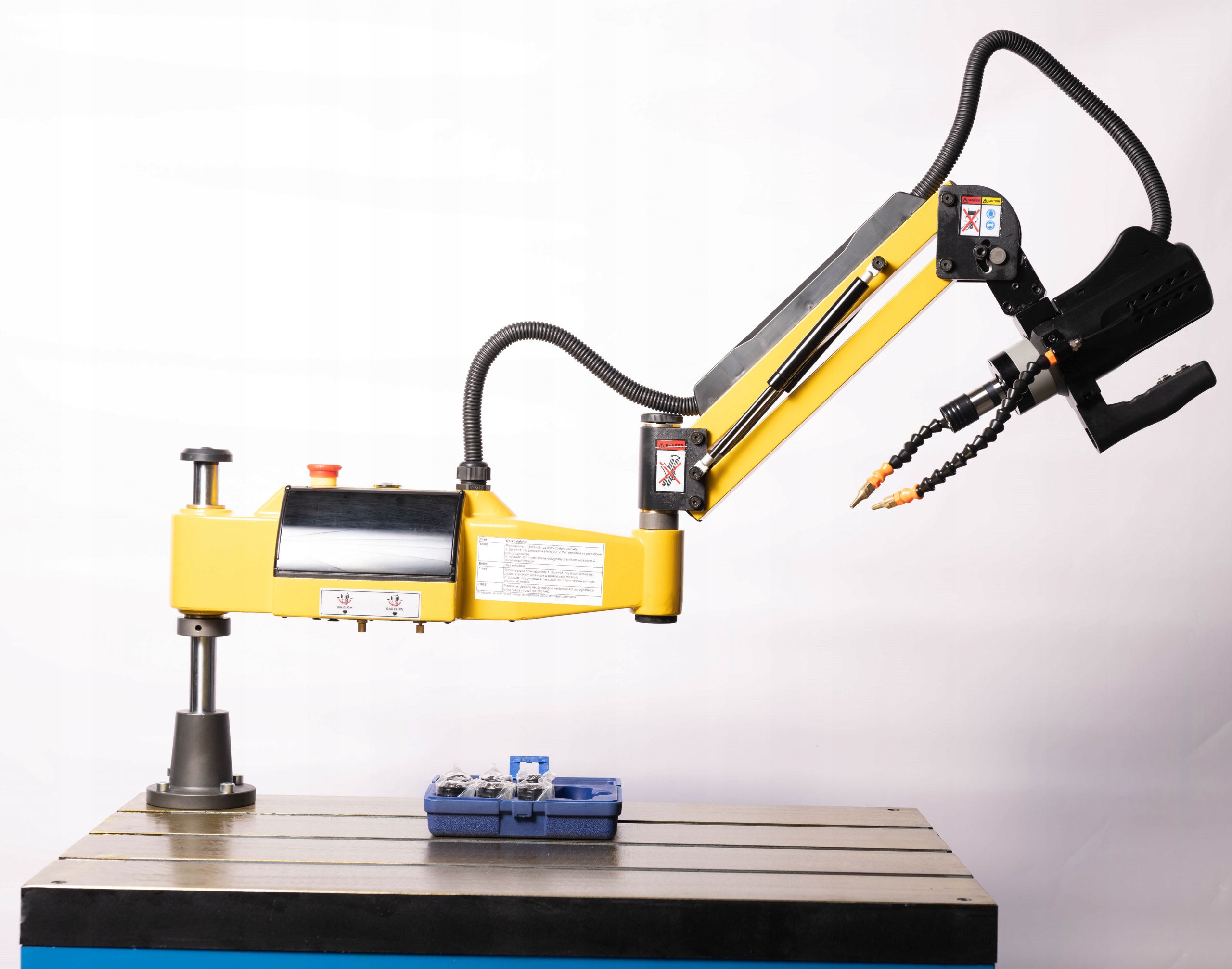 Електричний різьбонарізний верстат M3-M24швидкість 625 об. масляний туман заготовки при початку вставки, а протягом усього повернення друга форсунка видаляє стружку та надлишки мастила потоком повітря. Змішувач забезпечує плавне регулювання співвідношення масла і повітря в тумані. Машина поставляється зі шлангом з фільтром, який вставляється безпосередньо в балон з мастилом.