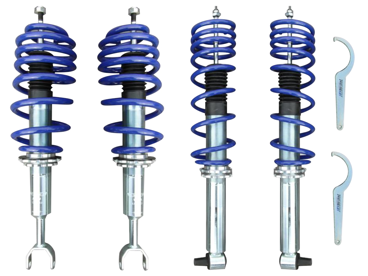 В комплекті 4 різьбових амортизатора, 4 спортивних пружини , гайковий ключ для регулювання висоти та сертифікат TUV