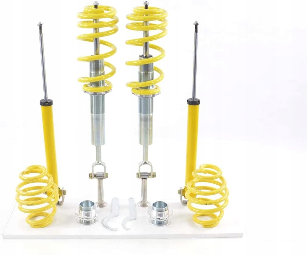 Підвіски Coilover мають газові амортизатори з підвищеною силою амортизації та укороченим робочим ходом. Високоякісний, повністю оцинкований сталевий корпус забезпечує тривалий термін служби завдяки різьбі, яка регулюється зовні від помірного до надзвичайного опускання в межах перевіреного діапазону регулювання. Діапазон регулювання залежить від автомобіля і знаходиться в діапазоні 35-65 мм, звичайно, сертифікований TUV. Підвіску можна швидко та легко відрегулювати за допомогою гайкового ключа, що входить у комплект. Занижені та більш жорсткі пружини забезпечують відмінні ходові характеристики автомобіля завдяки посиленню підвіски, що забезпечує комфорт водіння та більшу безпеку під час поворотів. Пружини з надзвичайно міцної хромо-силіконової сталі з подальшим пластиковим покриттям. Додатково вони характеризуються можливістю регулювання висоти передньої і задньої підвіски. Встановлення койловерної підвіски також покращує зовнішній вигляд автомобіля, додаючи спортивного характеру.