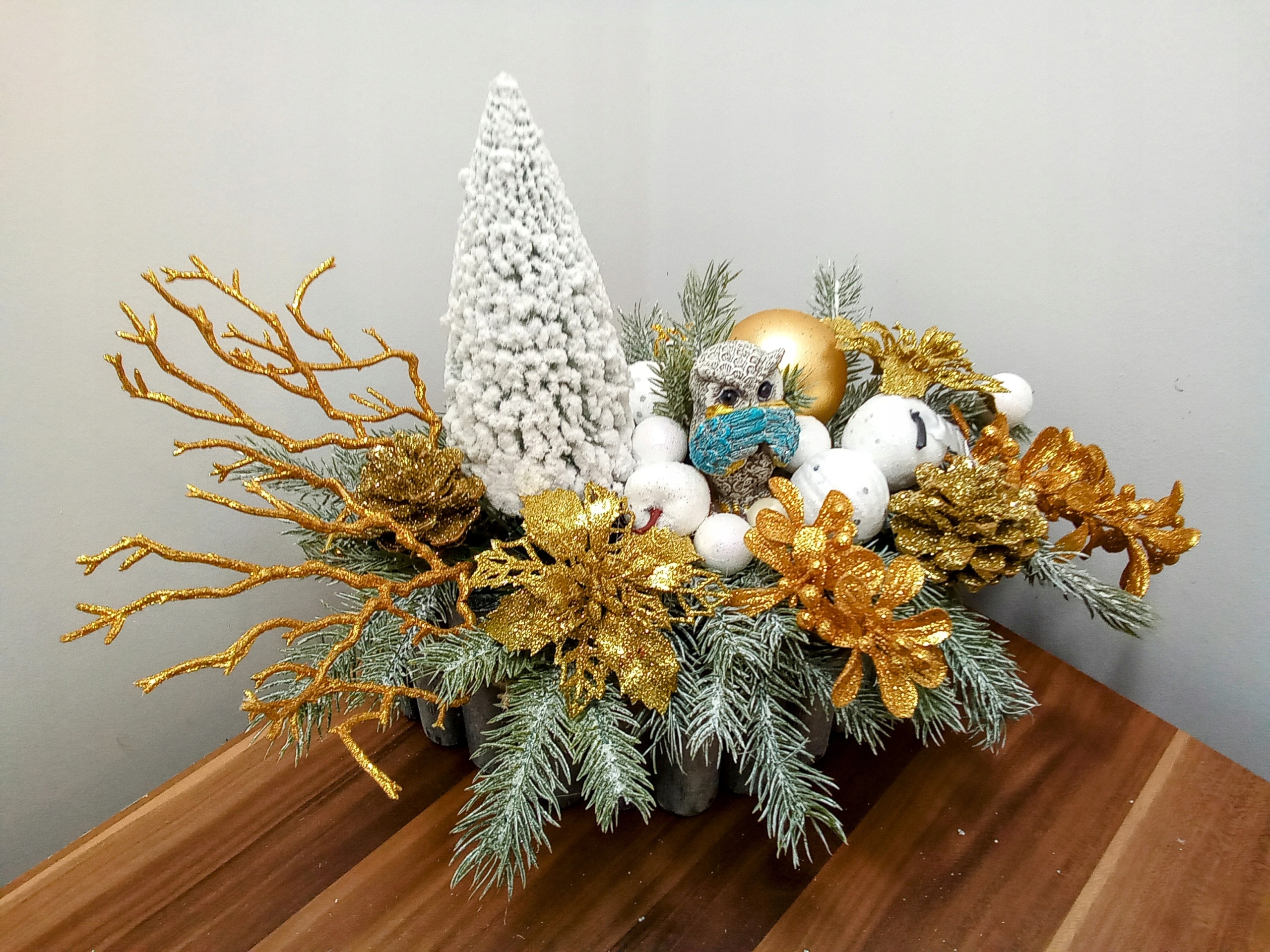 Чудова різдвяна композиція, прикраса для святвечірнього столу - зроблена із засніженої ялинки, кульок, квітів Віфлеємської зірки, декоративних ялинових гілок, у ніжних кольорах білого, золотого та зеленого, стане гарною прикрасою до Різдва. стіл.