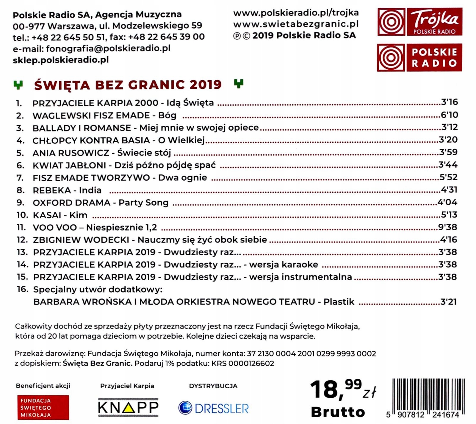 Пам'ятаєте "Карпію"? Ще недавно десь у ставку плавала малесенька, а тепер доросла, пухка рибка. І в нього все добре! Стільки жартів, бо справа, всупереч видимості, серйозна. Протягом багатьох років Radio Trójka організовує благодійні акції, спрямовані на допомогу дітям, які потребують допомоги. Цього року, традиційно, збір коштів супроводжується альбомом, цього разу під назвою «Різдво без кордонів 2019». Там ви знайдете 20-ту ювілейну пісню з циклу «Карп». Слова написав Куба Стшичковський, надійний журналіст Третьої програми Польського радіо, який проводить відомі благодійні аукціони в ефірі.
