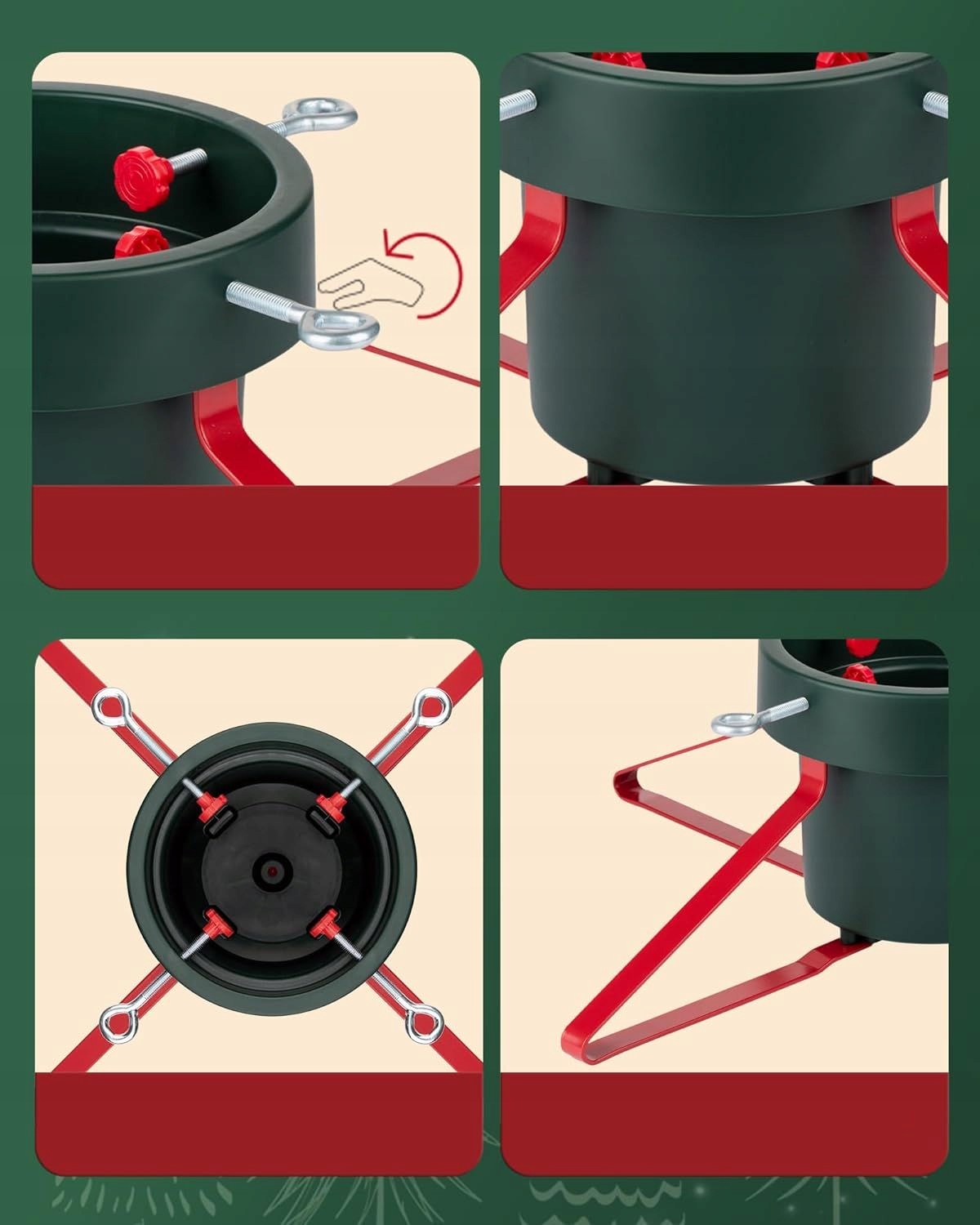 - en класична підставка для ялинки в червоній та зеленій різдвяній прикрасі. Незалежно від того, чи при прикрасі ялинки з друзями чи при прикрашенні церемонії дітьми-ця стійка стане основною точкою радісних моментів і дозволить вам насолоджуватися святковим теплом та магією. 4 Він оснащений 4 регульованими гвинтами, які кріплять і стабілізують багажник дерева, щоб забезпечити певну зчеплення, і в той же час можна легко регулювати.