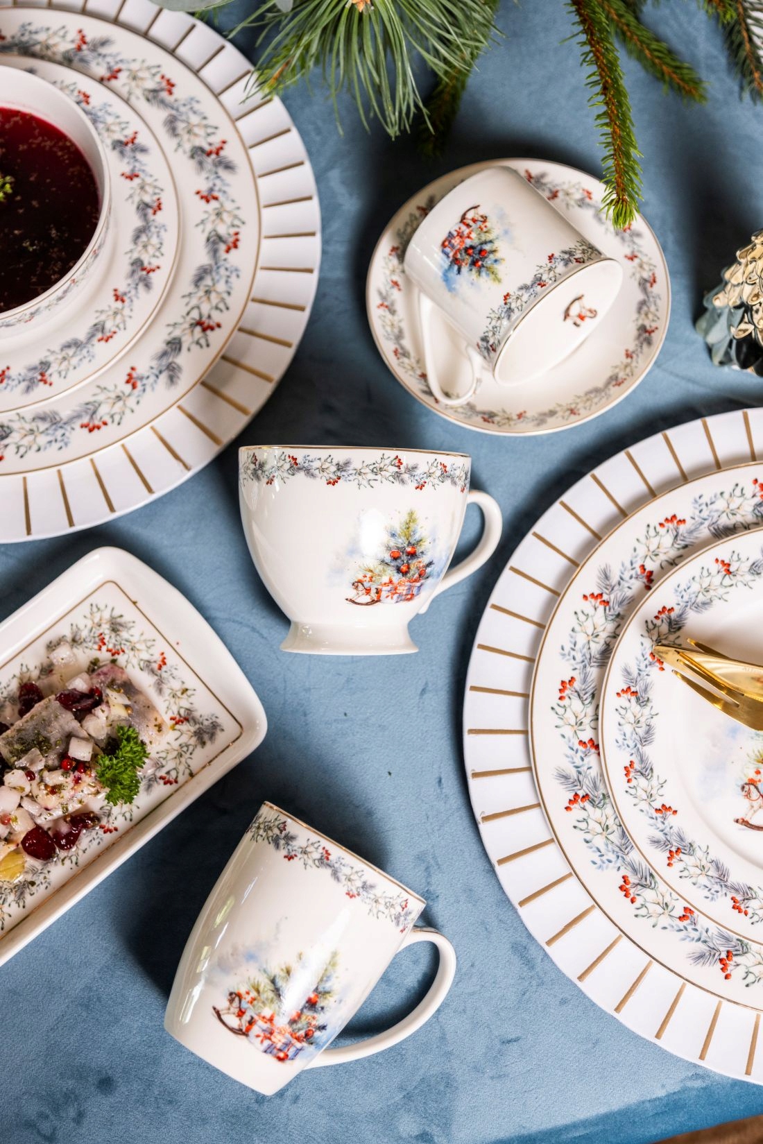 Витончені прикраси з ялинкою, гілками падуба та тонкими акцентами створюють чарівну атмосферу, а порцеляна найвищої якості робить колекцію не лише красивою, але й довговічною.