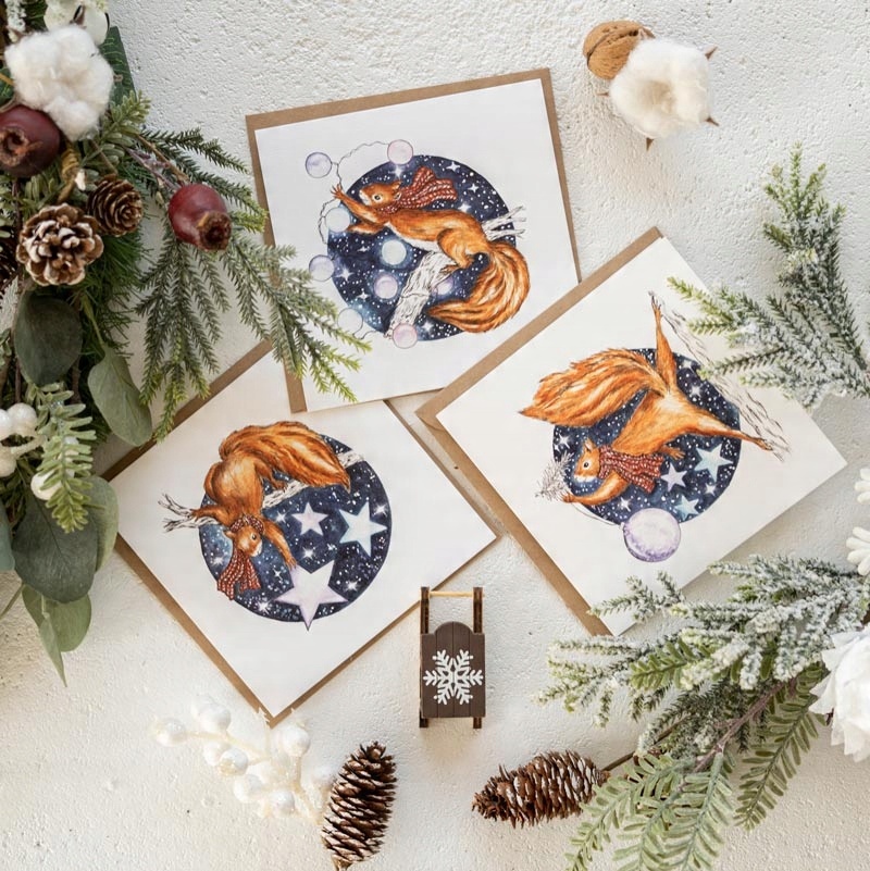 Різдво — це єдина пора року, коли вулиці та наші будинки повні різдвяних прикрас і світлове підсвічування. На почесному місці в будинку стоїть красиво прикрашена ялинка. Надішліть кілька теплих різдвяних слів своїм близьким. Листівка з дрібницею та гарною рудою білкою обов’язково викличе посмішку на їхніх обличчях.