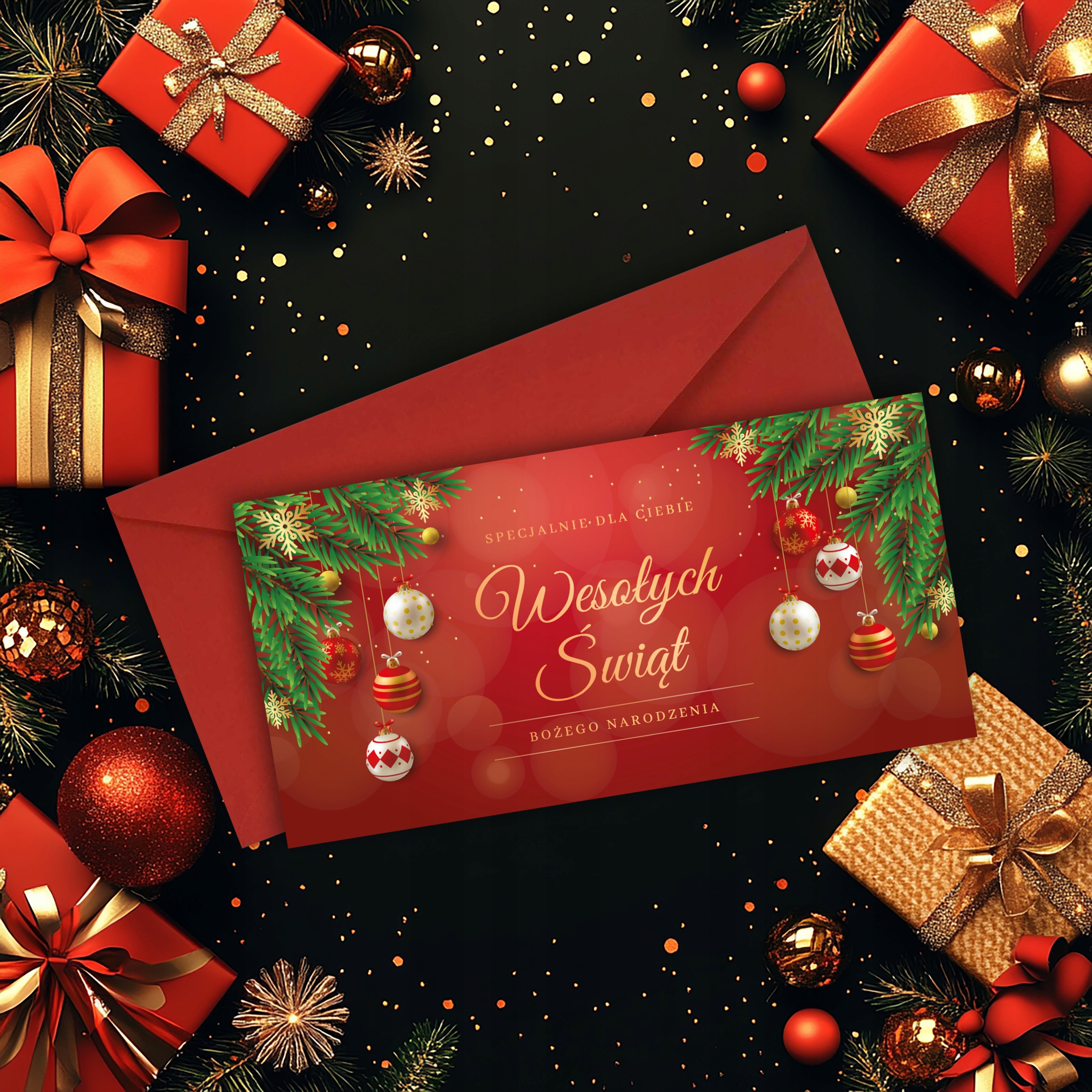 Складена листівка з написом «З Різдвом Христовим» у модних кольорах із золотими прикрасами, дрібничками та сніжинками. Всередині є місце для грошей і смужка для підпису вашого імені. Ідеальне оздоблення для різдвяного подарунка для ваших близьких.