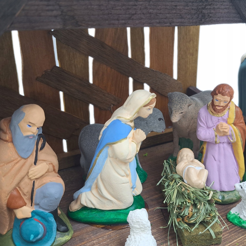 Великий різдвяний вертеп із 16 гіпсовими фігурками.