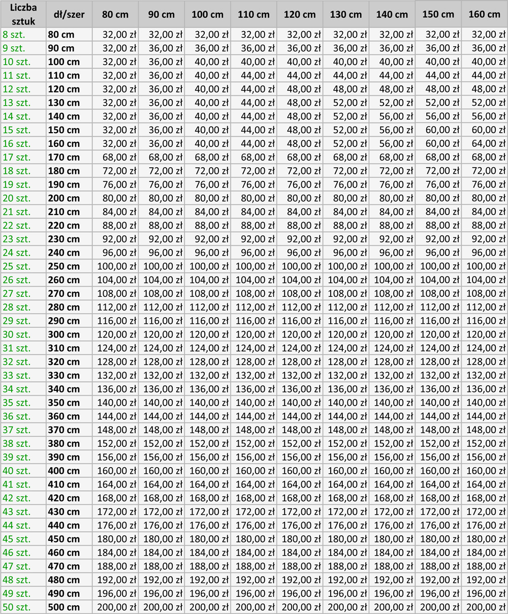 (4 злотих = 1 шт. за 10 см, для даного розміру - наприклад, 110x130 = 44 злотих = 11 шт. тощо)