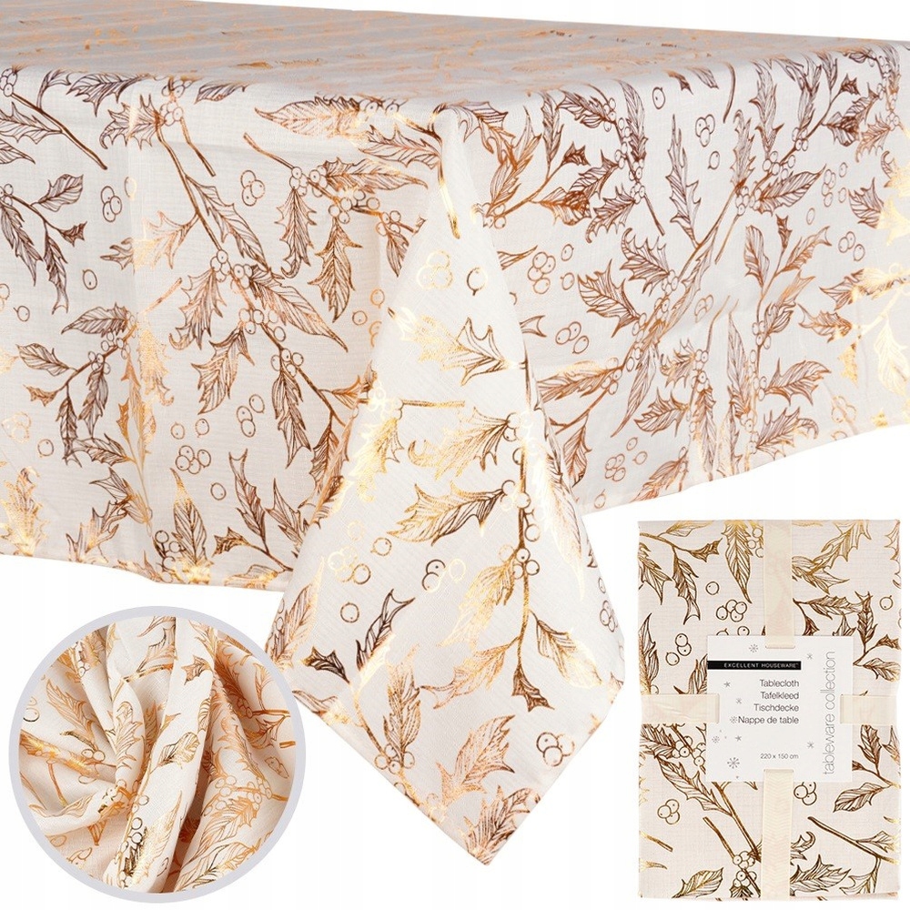 ✅ Міцний і стійкий - Скатертина з бежевого поліестеру з красивим золотистим різдвяним мотивом.