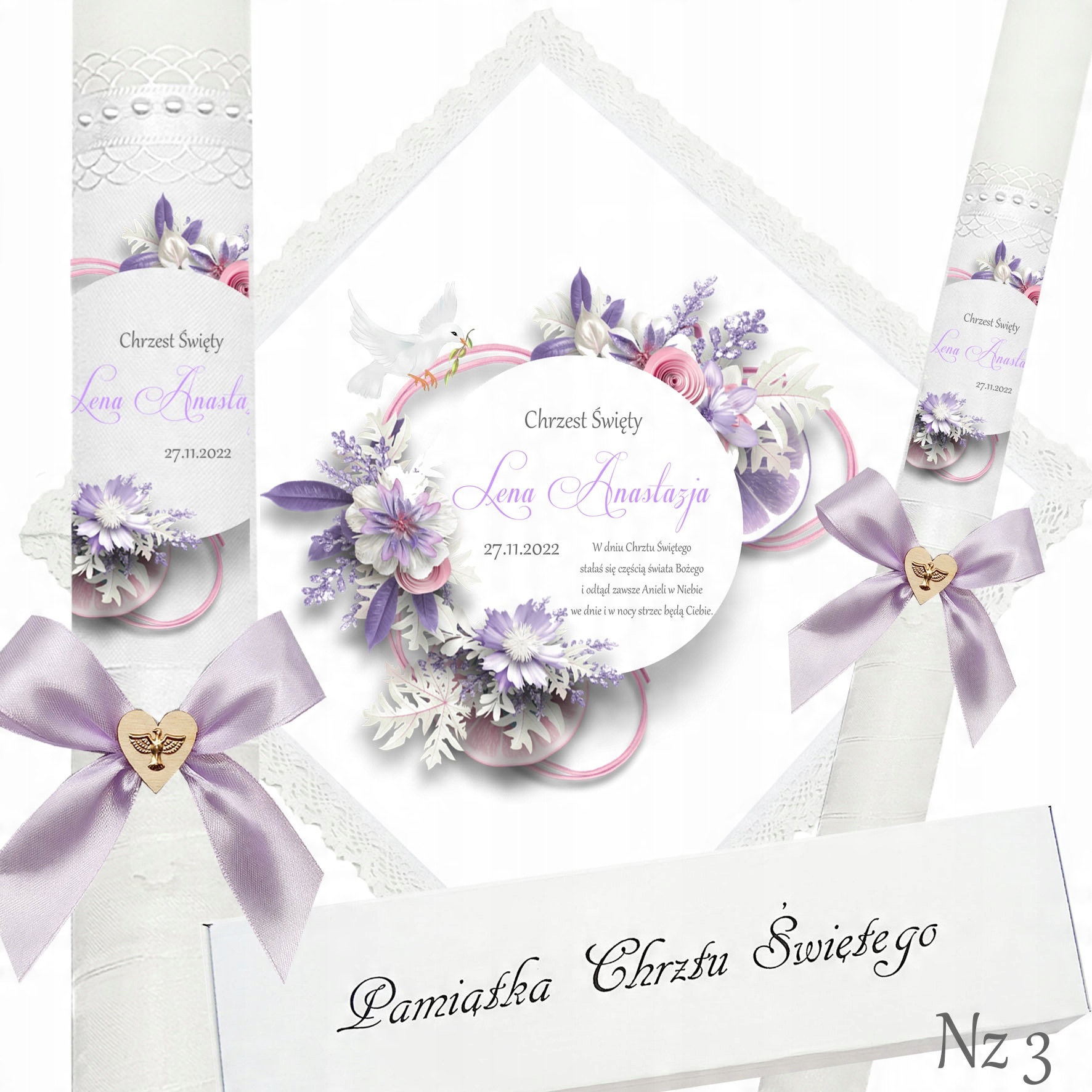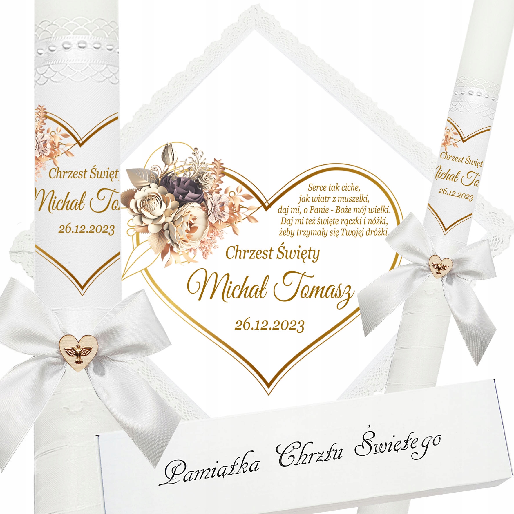 Представляємо надзвичайний набір для хрещення, що складається з ризи та свічки, ідеальний вибір для батьків які хочуть відсвяткувати цей особливий день елегантно та незабутньо. Свічка прикрашена білою шифоновою стрічкою, що додає їй неповторний характер і шарм. Верх свічки прикрашений атласним мереживом і білими перлами, що надає їй елегантності та шику. Лук з дерев'яним серцем і металевою золотою емблемою Святого Духа. додає чарівності та сентиментальності. Все було запаковано в декоративну коробку, яка дозволяє зберігати ці незвичайні сувеніри.