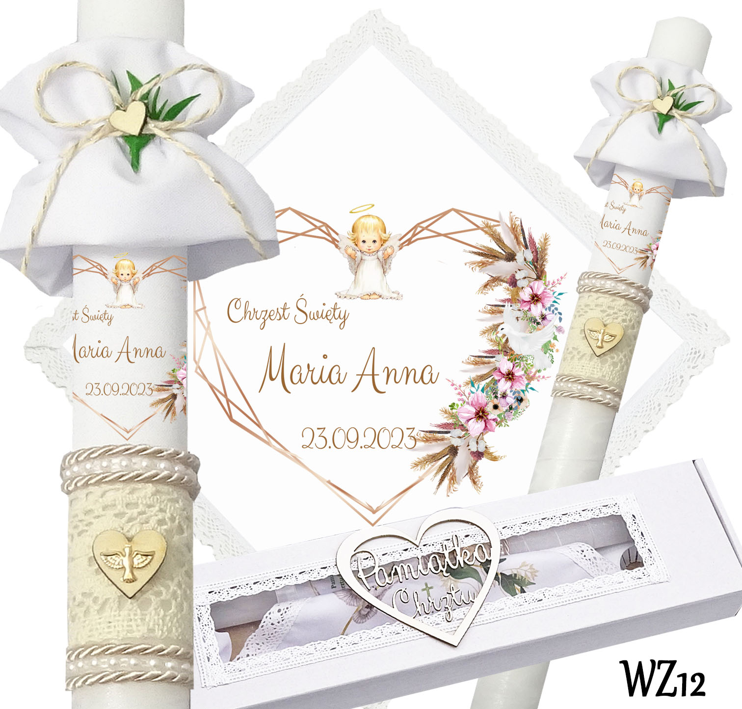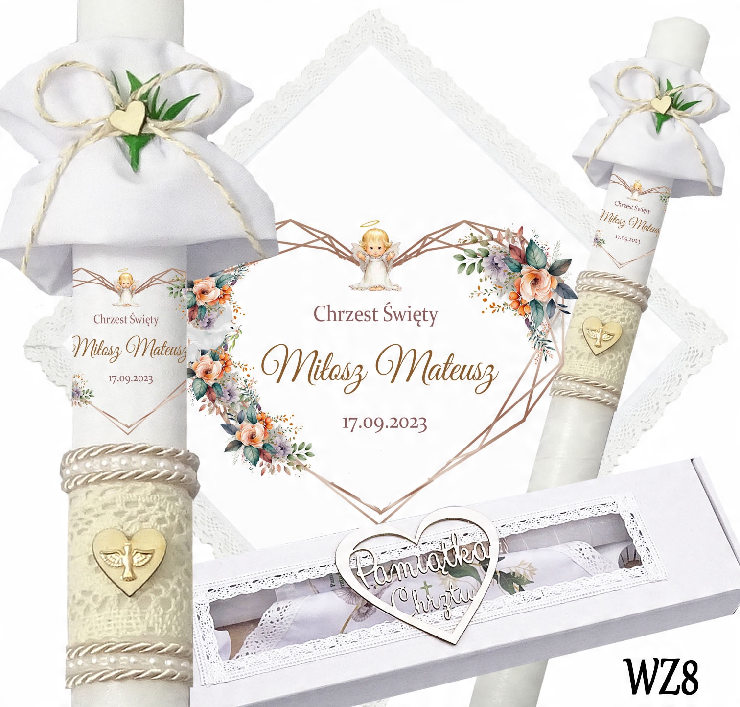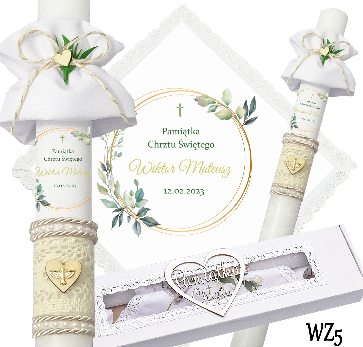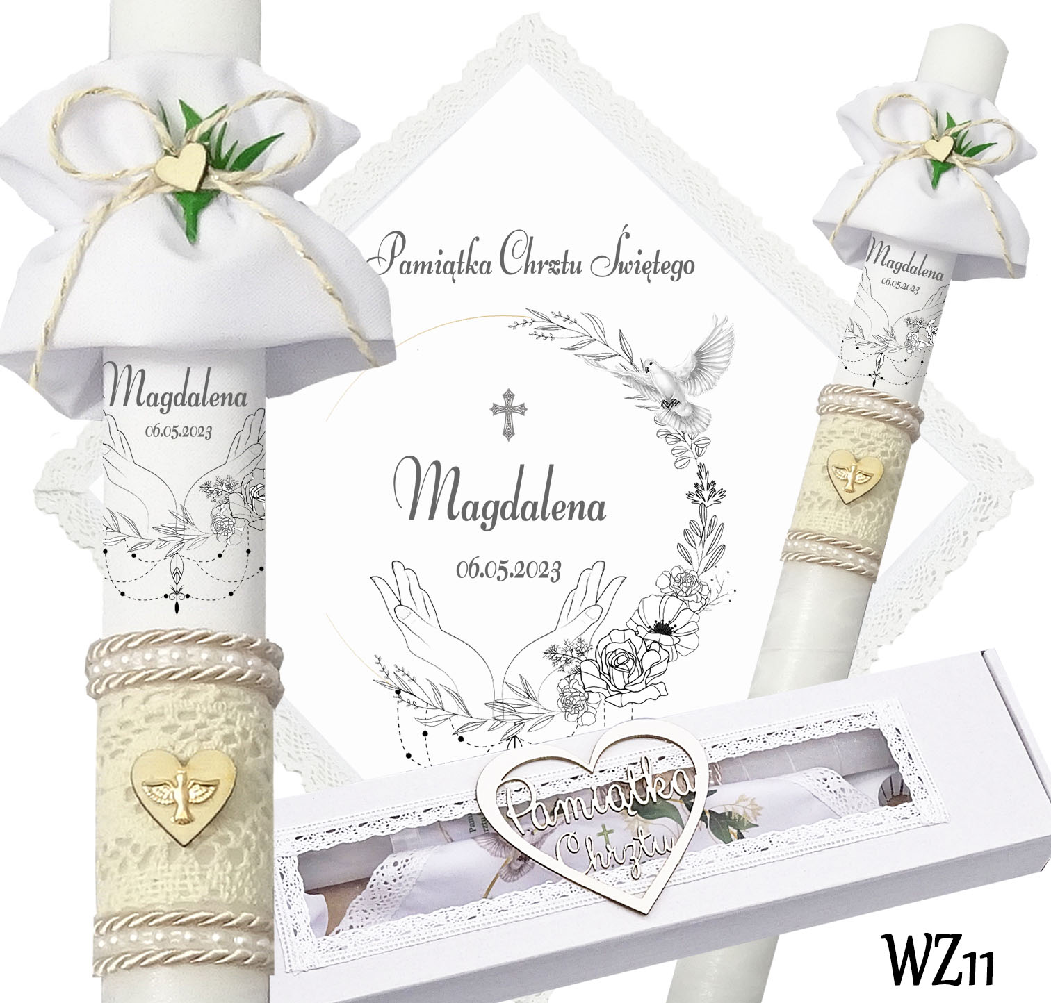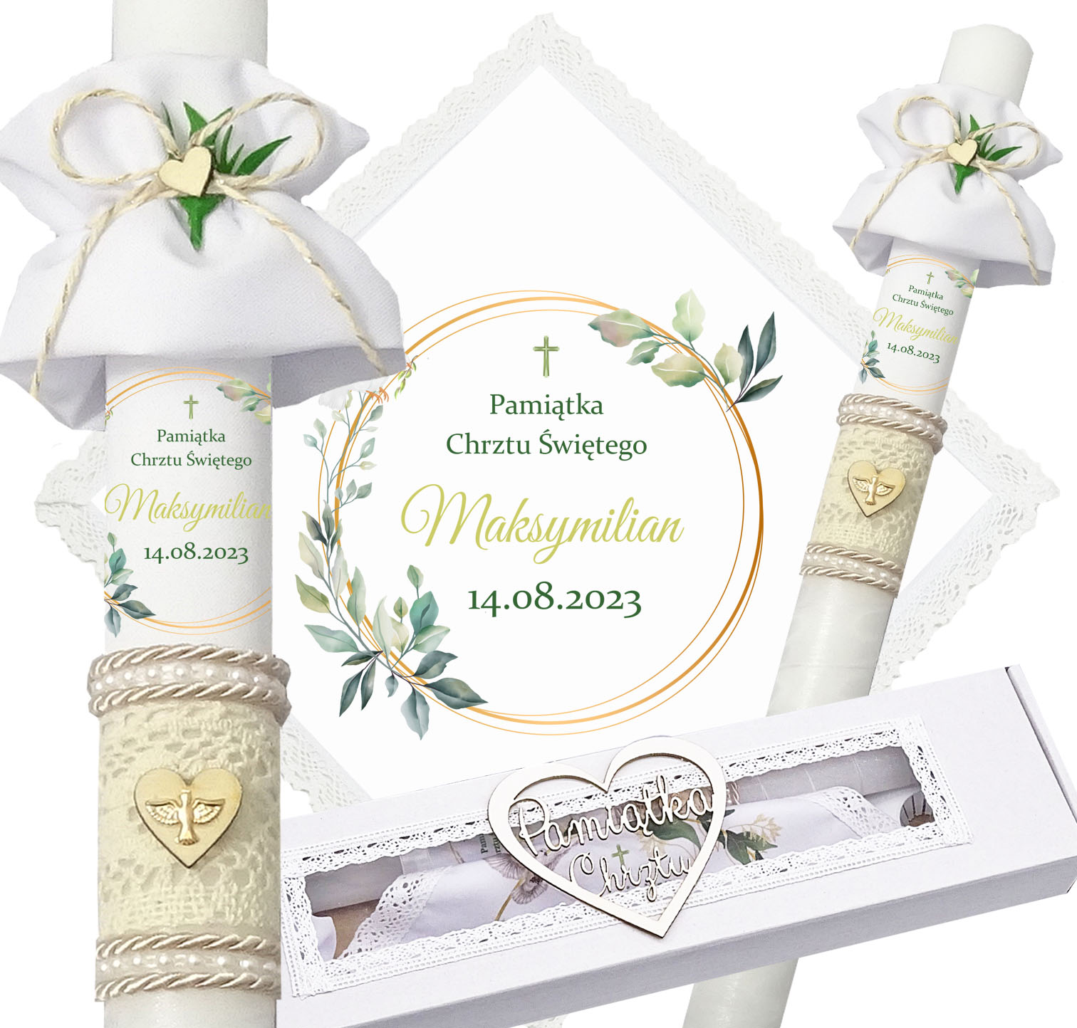 Представляємо надзвичайний набір з хрестильної ризи та свічки, створений з урочистим подія в житті кожної дитини. Халат виготовлений з білосніжного матеріалу та оброблений бавовняним мереживом, що надає йому елегантності та ніжності. Свічка декорована вручну і має принт з ім'ям дитини, що робить її унікальним і унікальним сувеніром. Свічка має нитку бежевого кольору, на її поверхні мереживо і дерев'яне серце з золотим символом Святого Духа. Інша частина свічки обмотується білою шифоновою стрічкою. Все це упаковано в картонну коробку і в комплект входить тканинна перка. Цей унікальний набір із одягу та свічки, безумовно, підкреслить церемонію хрещення та посилить емоції та спогади, пов’язані з цією особливою подією.