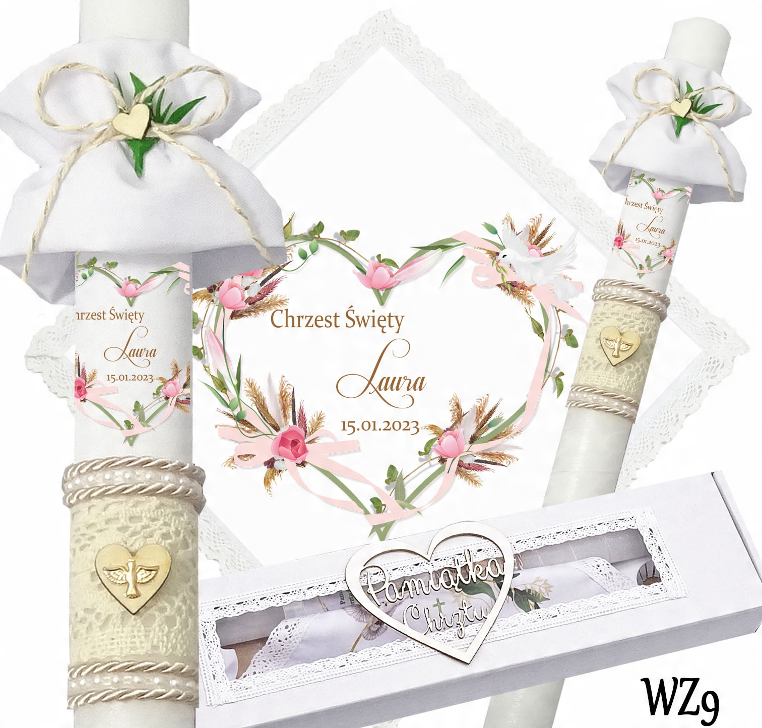 Біла картонна коробка для хрестильної тканини та свічка з віконцем прикрашена бавовняним мереживом і 3D написом у формі серця. Ця елегантна та витончена упаковка чудово виглядатиме як сувенір.