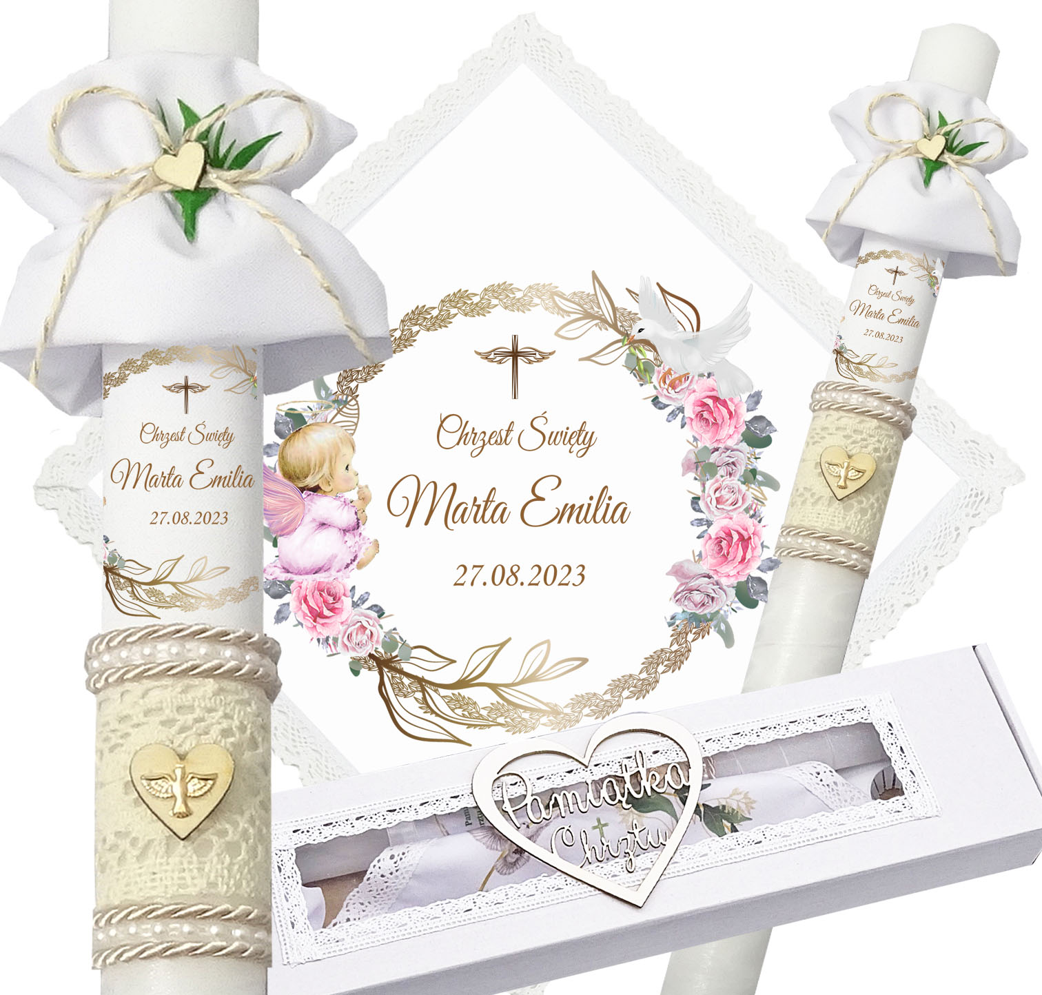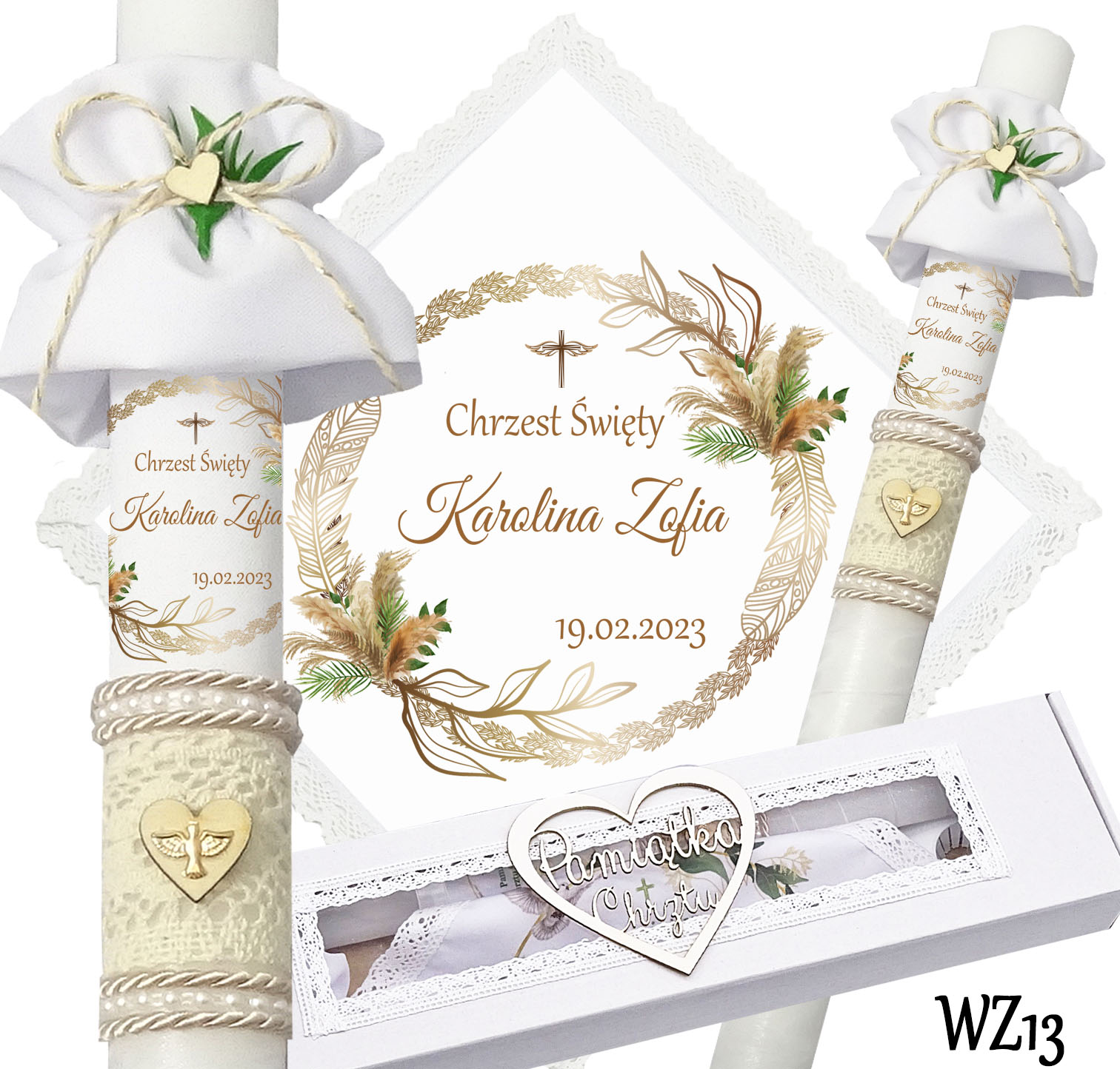 Представляємо надзвичайний набір з хрестильної ризи та свічки, створений з урочистим подія в житті кожної дитини. Халат виготовлений з білосніжного матеріалу та оброблений бавовняним мереживом, що надає йому елегантності та ніжності. Свічка декорована вручну і має принт з ім'ям дитини, що робить її унікальним і унікальним сувеніром. Свічка має нитку бежевого кольору, на її поверхні мереживо і дерев'яне серце з золотим символом Святого Духа. Інша частина свічки обмотується білою шифоновою стрічкою. Все це упаковано в картонну коробку і в комплект входить тканинна перка. Цей унікальний набір із одягу та свічки, безумовно, підкреслить церемонію хрещення та посилить емоції та спогади, пов’язані з цією особливою подією.