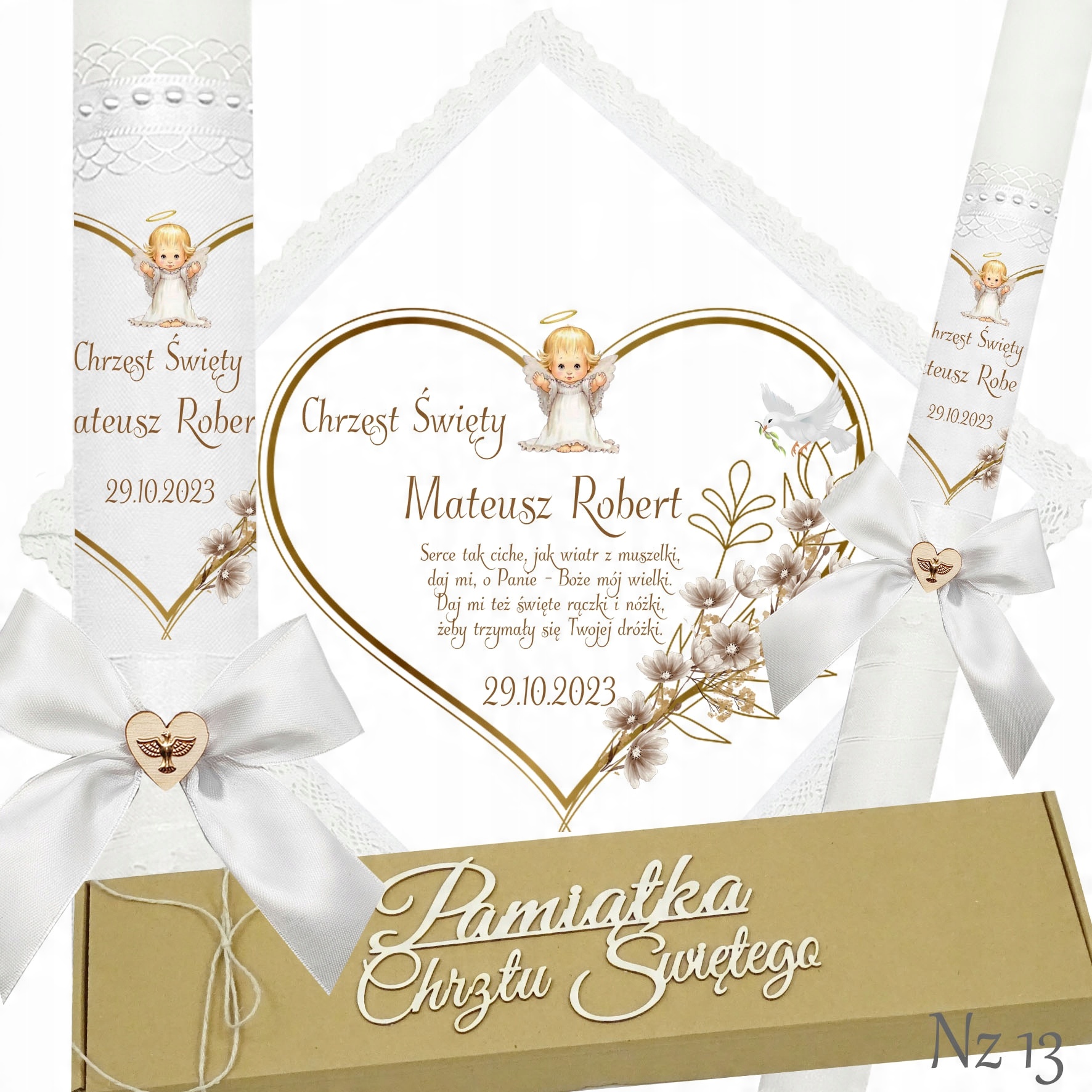 Представляємо надзвичайний набір для хрещення, який складається з ризи та свічки, це ідеальний вибір для батьків, які хочуть відсвяткувати цей особливий день елегантно та незабутньо. Свічка прикрашена білою шифоновою стрічкою, що додає їй неповторний характер і шарм. Верх свічки прикрашений атласним мереживом і білими перлами, що надає їй елегантності та шику. Лук з дерев'яним серцем і металевою золотою емблемою Святого Духа. додає чарівного та сентиментального акценту.Все це упаковано в картонну еко-коробку з 3D написом «Сувенір на Святе Хрещення».Цей унікальний набір з ризи та свічки неодмінно підкреслить церемонію хрещення та посилить емоції та спогади, пов'язані з цим особливий випадок. p>
