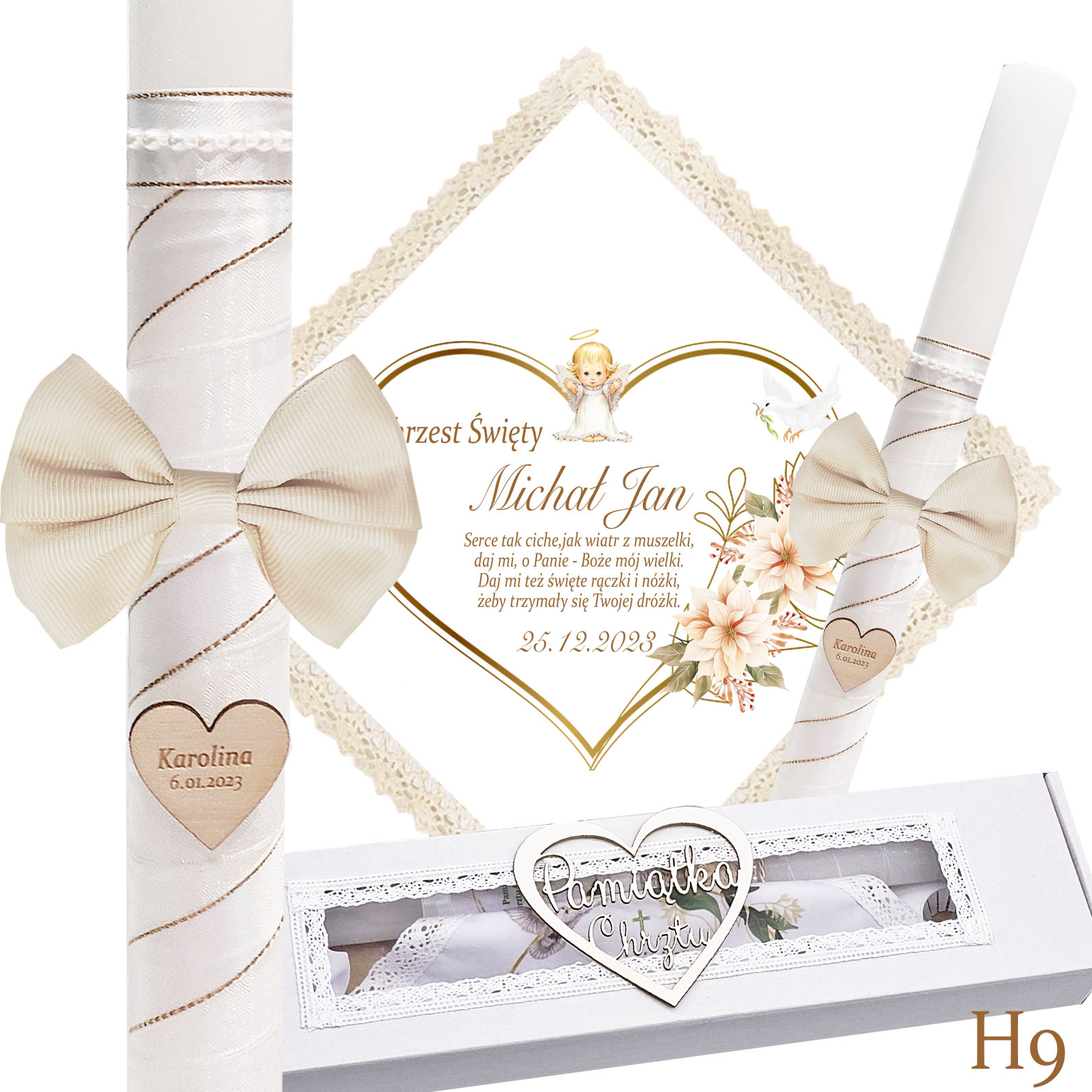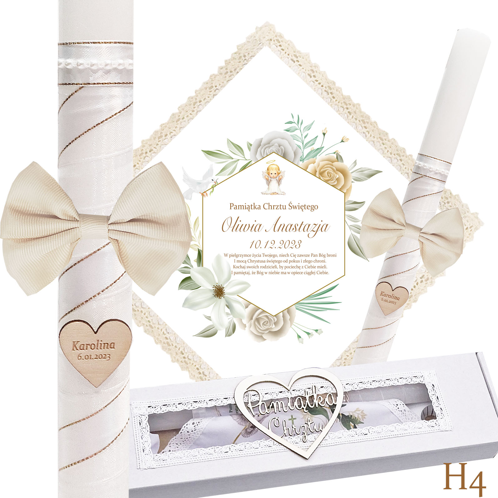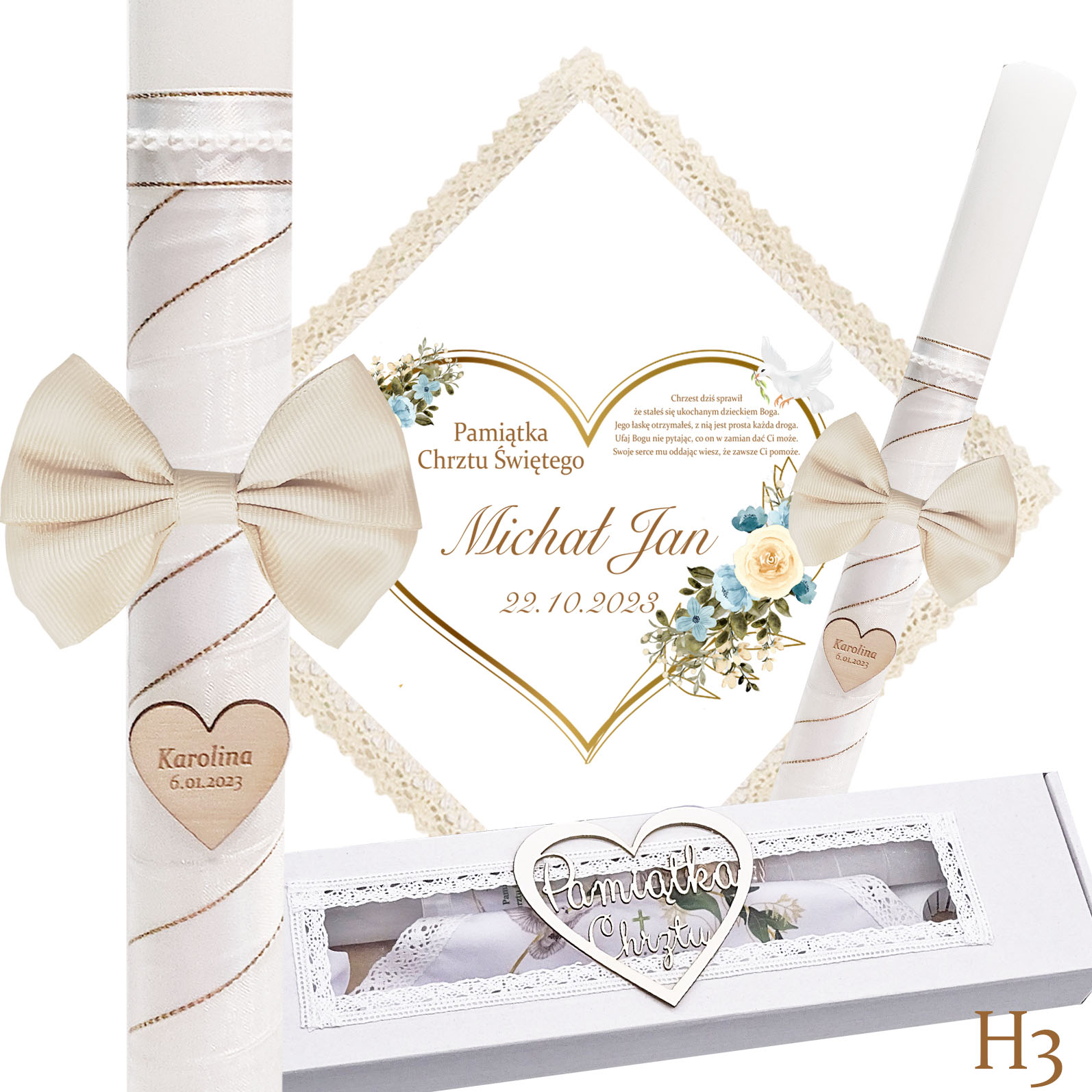 Наша хрестильна свічка — це не лише джерело світла, а й теж красива прикраса. Він обмотаний білою шифоновою стрічкою та білою атласною стрічкою із золотою ниткою, на ній гарний бантик. Також на свічці є серце з ім'ям дитини та, за бажанням, датою хрещення.
